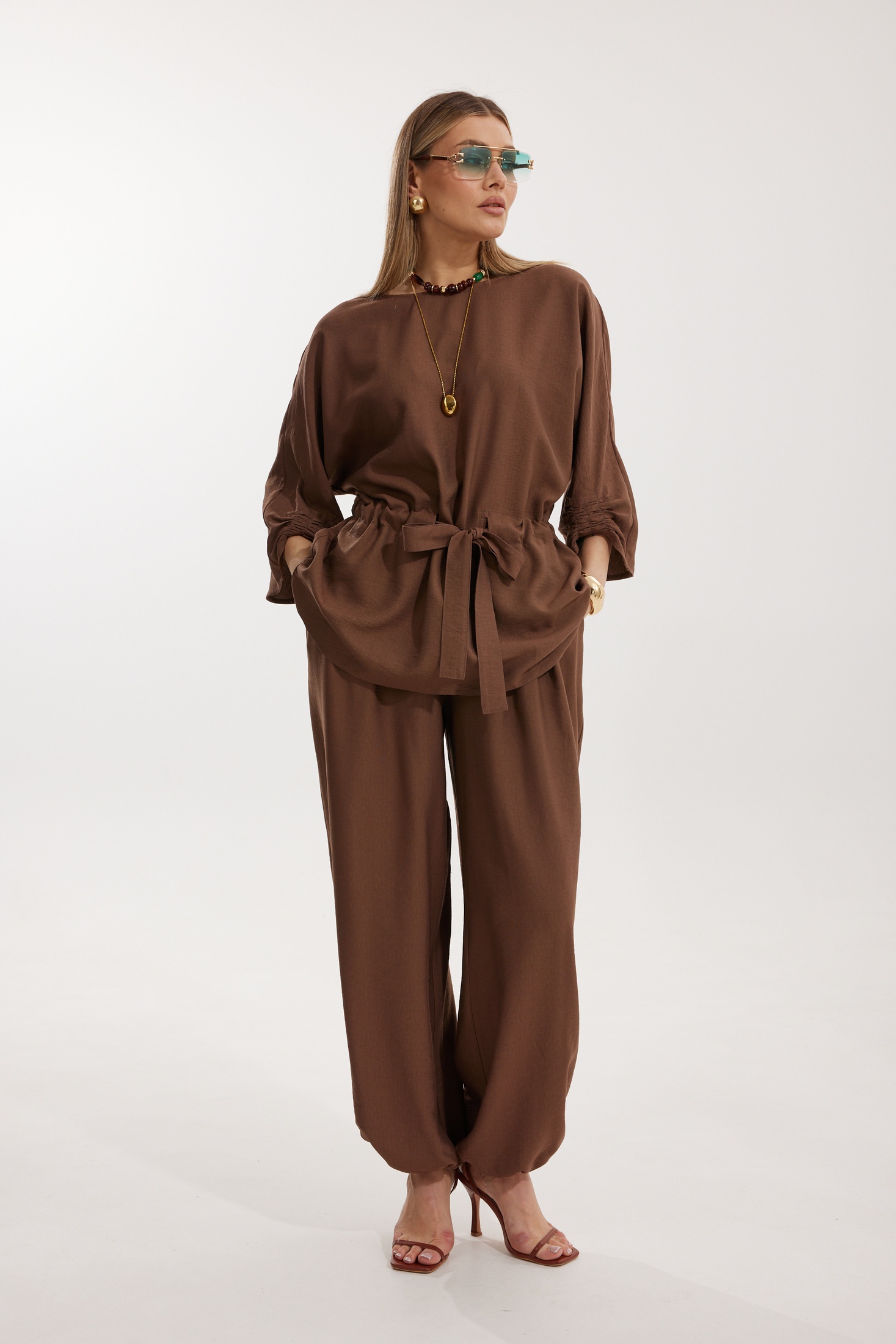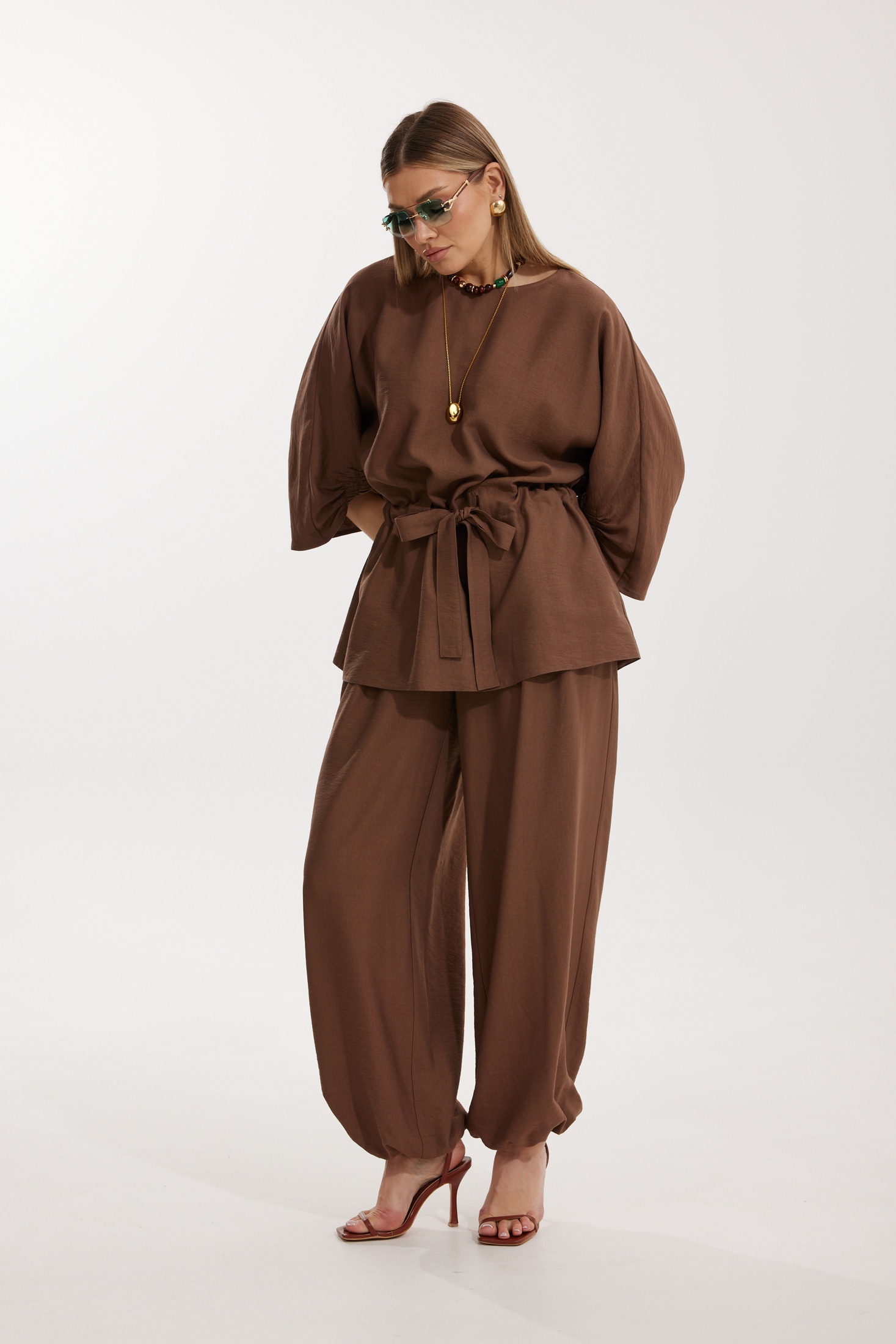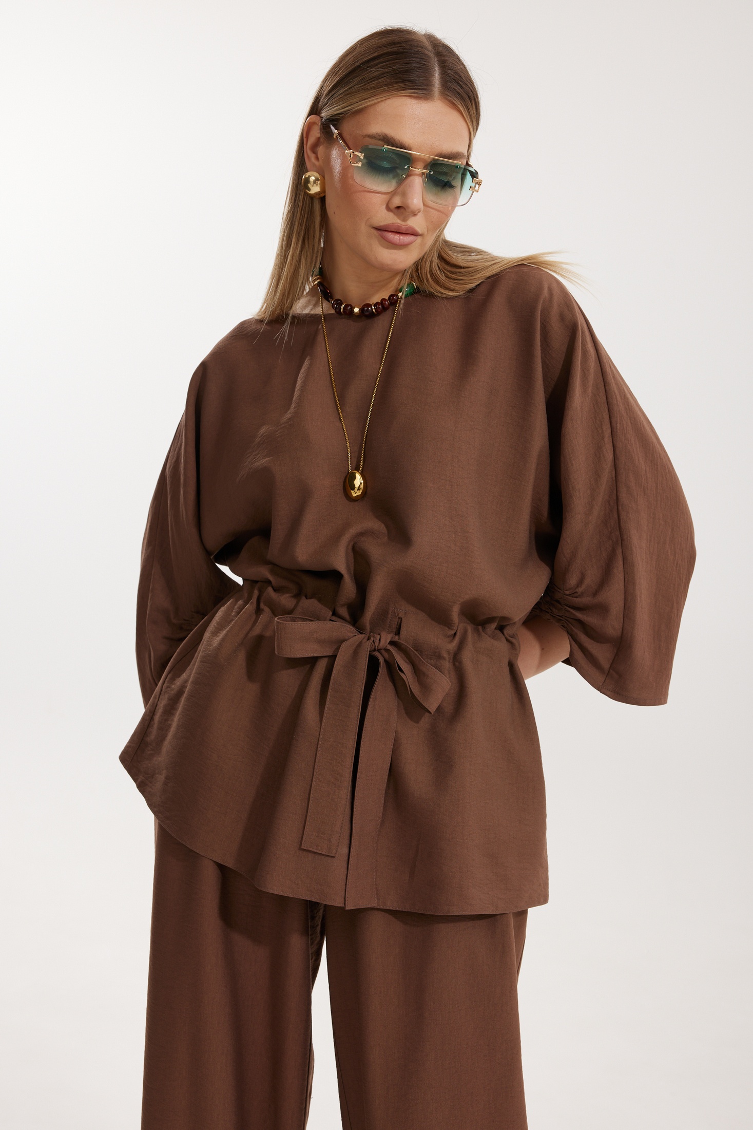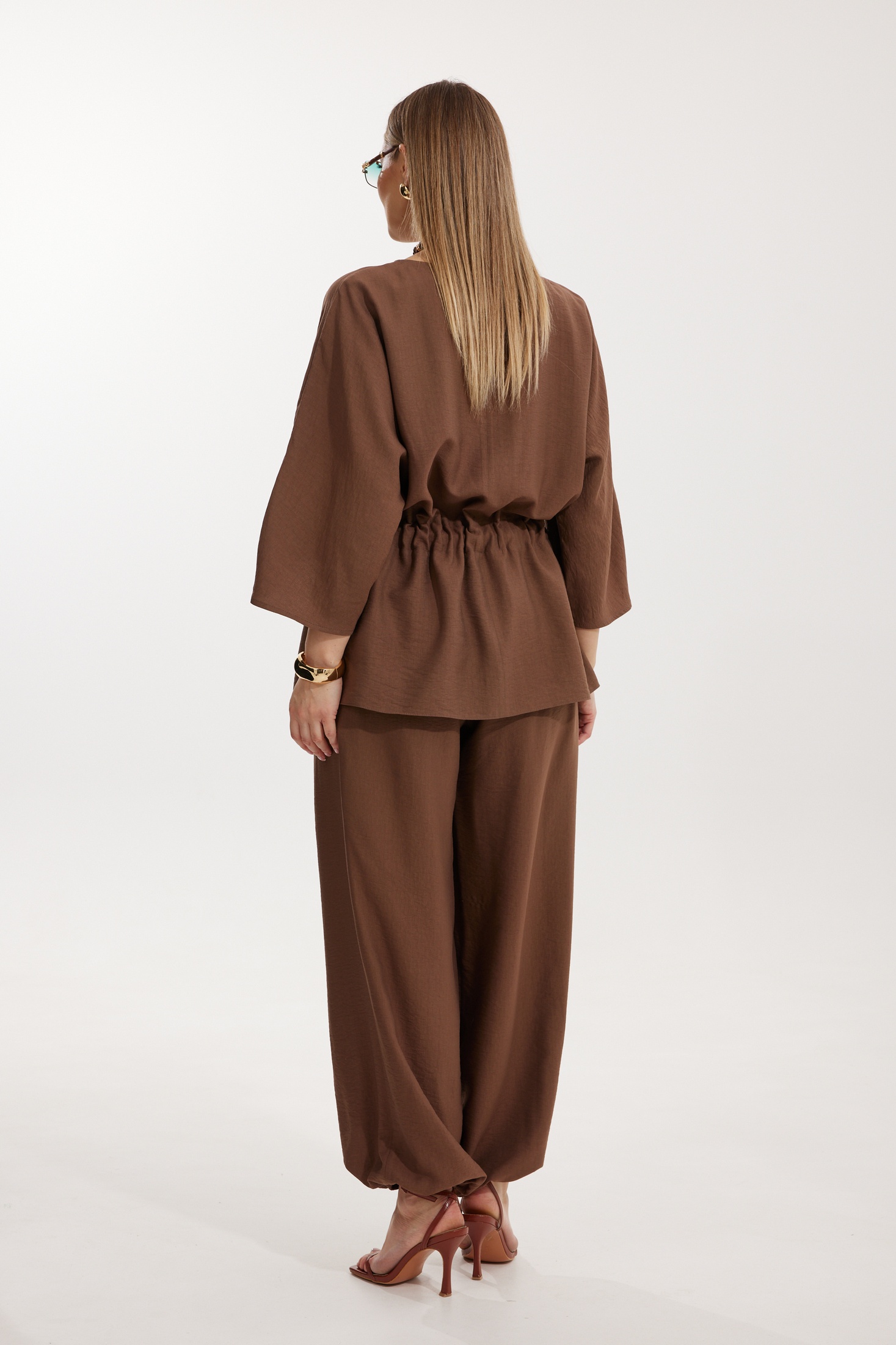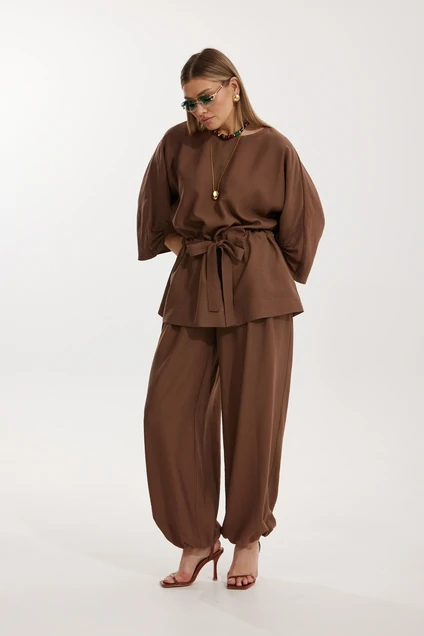 Костюм брючный 2304-2 Kaloris гармонично сочетает в себе повседневный стиль и комфорт. Коллекция бренда Kaloris выполнена из мягкой и дышащей ткани с высоким содержанием вискозы, что обеспечивает приятные тактильные ощущения. Блуза «летучая мышь» отличается удлиненным фасоном и свободой движения, подчеркивая женственность. В конструкции присутствует кулиса с широким поясом, что обеспечивает удобство посадки. Брюки прямого силуэта с резинкой на поясе и внизу позволяют создать стильный образ. Костюм дополнен наклонными карманами и отрезными элементами, что добавляет лепту в его функциональность. Отлично подходит для осеннего и весеннего сезонов благодаря универсальному цвету, а также незаменим для деловых встреч и прогулок. Размеры изделия: длина спинки 73 см, длина рукава 61 см, длина брюк 110 см.