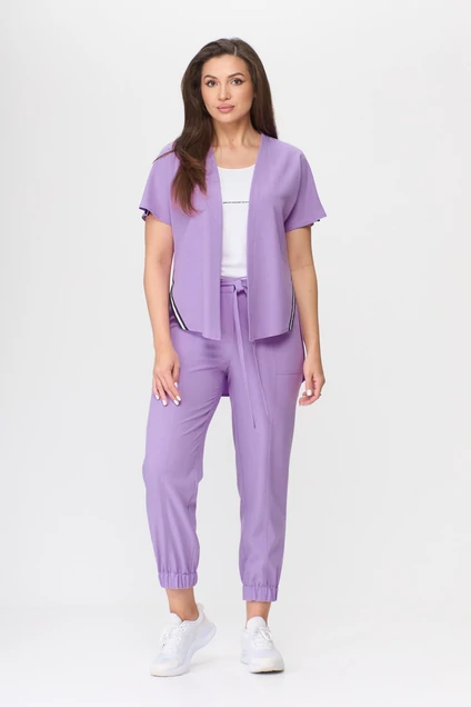 Комплект женский трехпредметный. Состоит из накидки, брюк и топа. Накидка свободного покроя, без застежки. По боковым швам разрезы, декорированы отделочной тесьмой. Линия плеча спущена. Рукав с манжетой и патой по низу. Топ с круглым вырезом горловины без рукавов, по переду декорирован принтом. Брюки свободного покроя с карманами по переду. Верх брюк обработан поясом с эластичной резинкой и втачным декоративным поясом. По низу брюк эластичная резинка