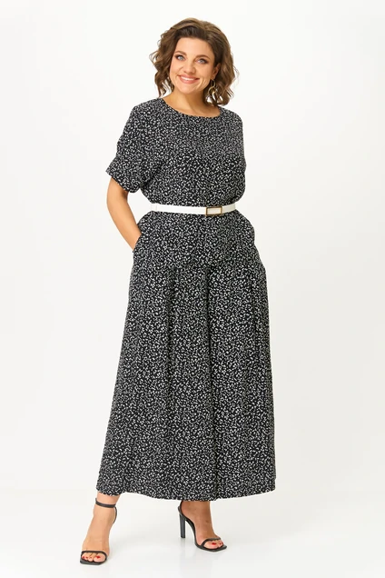 Костюм двойка, состоящий их блузы и юбки-брюк. Блуза с округлым вырезом горловины, плечо спущенное с отложной манжетой. Юбка-брюки на притачном поясе частично на резинке и карманами в боковых швах. Длина блузы 66 см , длина брюк 95 см. Съемный пояс в комплекте.