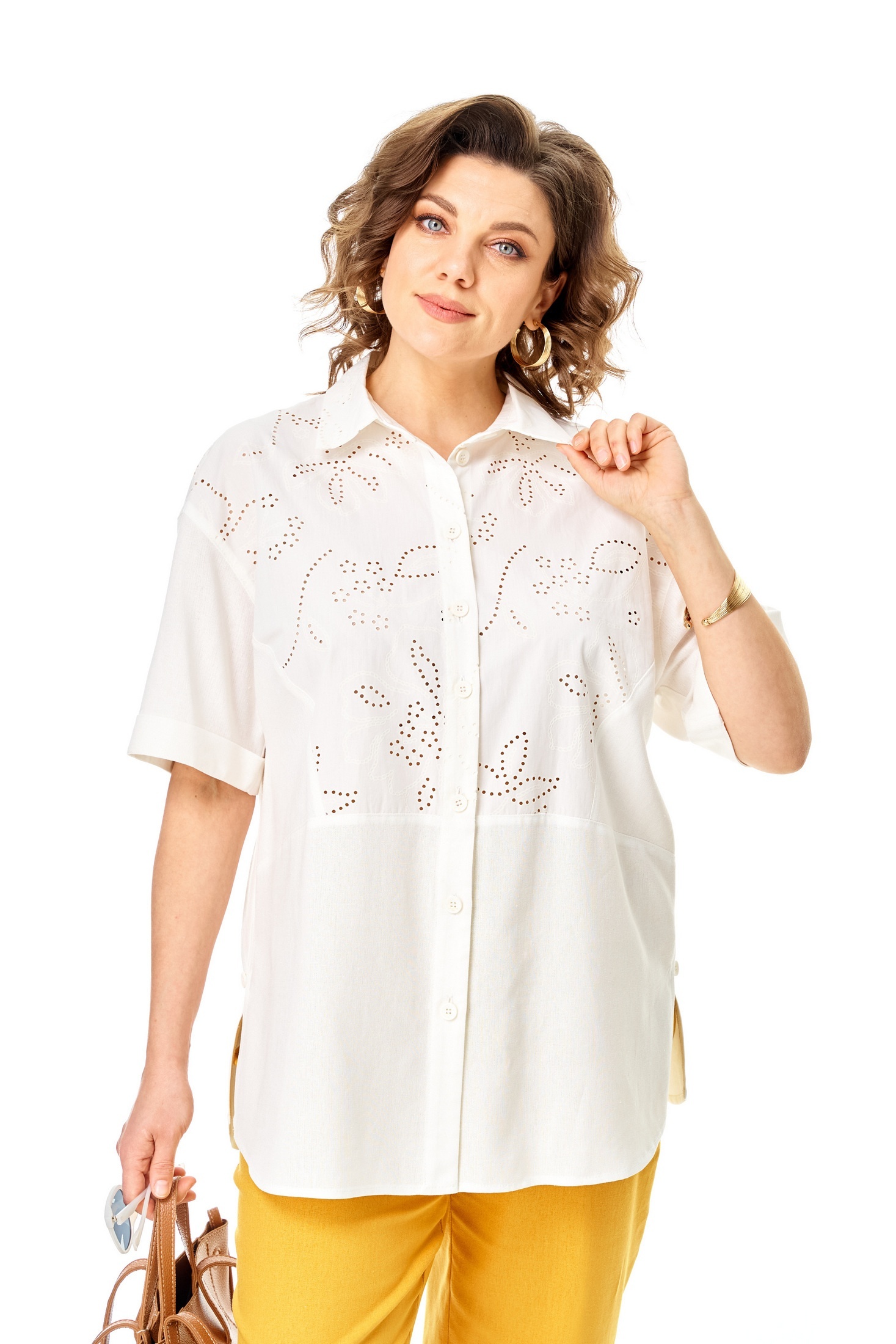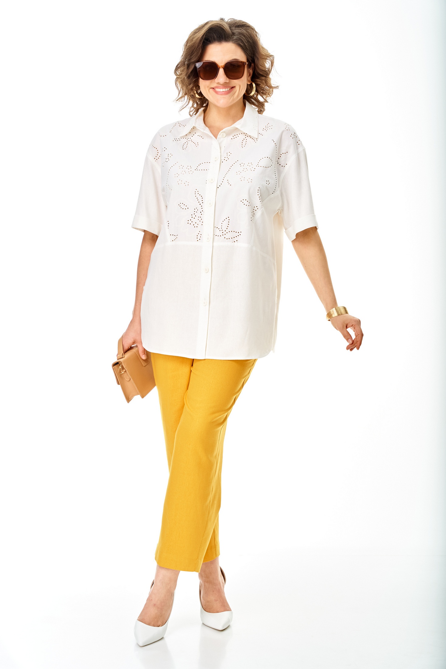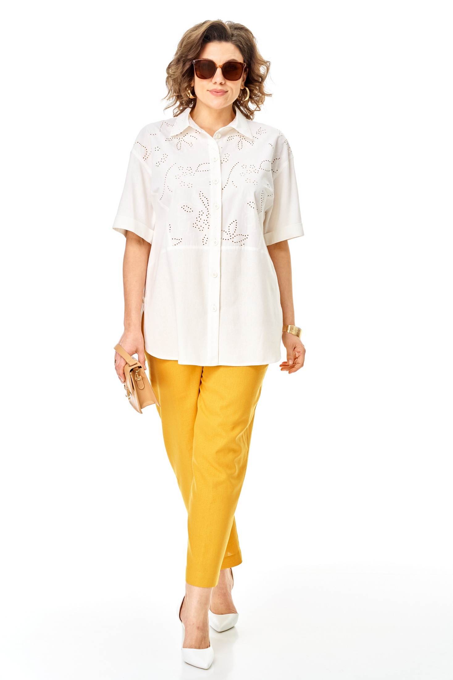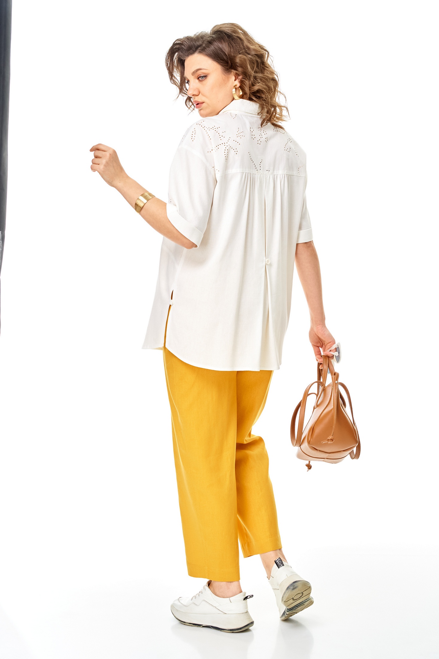 Костюм брючный 1446 молочный + желтый Karina Delux — это стильное и удобное решение для вашего гардероба. Коллекция бренда Karina Delux воплощает в себе комфорт и безупречный стиль. Комплект выполнен из мягкой льняной ткани с вставками из хлопкового полотна, украшенного цветочным рисунком-перфорацией. Блузон свободного силуэта с рубашечным воротником и классической застёжкой на пуговицы, дополнен декоративной петелькой и пуговицей на разрезах боковых швов. Брюки прямого кроя, слегка зауженные к низу, также выполнены из льняного полотна и имеют притачной пояс с застёжкой на пуговицу и молнию, а также карманы в области боковых швов. Этот костюм идеален для весенне-летнего сезона и подходит для прогулок и повседневных выходов благодаря своему свежему молочно-жёлтому цвету.