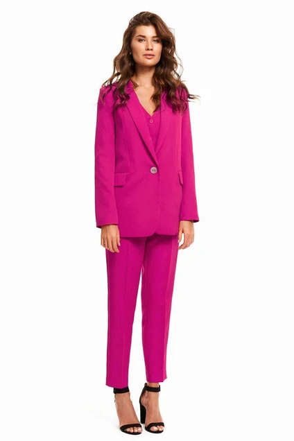 Шикарный 3-х предметный комплект состоящий из жакета, жилета и брюк. Универсальный женский жакет на подкладке прямого силуэта. Перед с центральной застежкой на одну пуговицу, с карманами и с клапанами в шве. Воротник стояче-отложной втачной с отворотом лацкана. Рукав двухшовный, втачной. Жилетка женская умеренного объема полуприлегающего силуэта. Перед с талиевыми вытачками и имитацией карманов с листочкой. Спинка с талиевыми вытачками. Жилетка на притачной подкладке. Застежка центральная, на прорезные петли и пуговицы. Длина жилетки до уровня линии бедер. Брюки базовые со стрелками. Изделие имеет комфортную средней посадку. Брюки на притачном поясе со шлёвками. Спереди боковые функциональные карманы, сзади имитация прорезных карманов с листочкой. Длина жакета - 73 см. Длина рукава – 63 см . Длина жилета - 68 см. Длина брюк по боковому шву с поясом - 98 см.