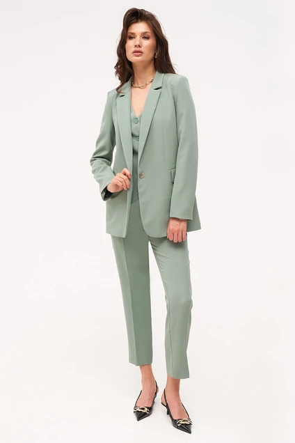 Шикарный 3-х предметный комплект состоящий из жакета, жилета и брюк. Универсальный женский жакет на подкладке прямого силуэта. Перед с центральной застежкой на одну пуговицу, с карманами и с клапанами в шве. Воротник стояче-отложной втачной с отворотом лацкана. Рукав двухшовный, втачной. Жилетка женская умеренного объема полуприлегающего силуэта. Перед с талиевыми вытачками и имитацией карманов с листочкой. Спинка с талиевыми вытачками. Жилетка на притачной подкладке. Застежка центральная, на прорезные петли и пуговицы. Длина жилетки до уровня линии бедер. Брюки базовые со стрелками. Изделие имеет комфортную средней посадку. Брюки на притачном поясе со шлёвками. Спереди боковые функциональные карманы, сзади имитация прорезных карманов с листочкой. Длина жакета - 73 см. Длина рукава – 63 см . Длина жилета - 68 см. Длина брюк по боковому шву с поясом - 98 см.