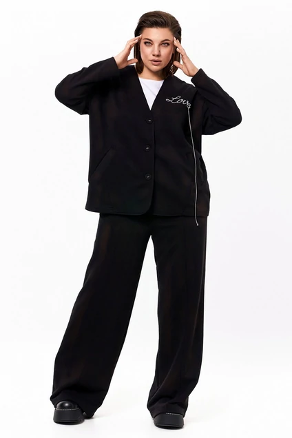 Кардиган из футера 3-х нитки с контрастной вышивкой шнуром. Застёжка на пуговицы. Брюки из футера 3-х нитки прямые от бедра. На резинке по талии и с контрастным шнуром. По переду отстроченные защипы.