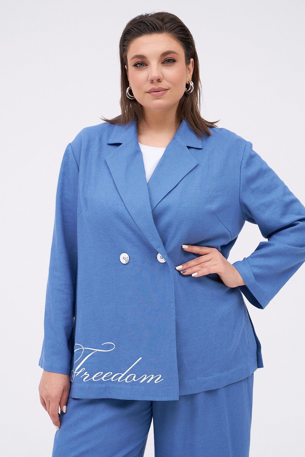 2-х предметный костюм, состоящий из жакета и брюк. Двубортный жакет прямого силуэта без подкладки со спущенной линией плеча и застёжкой на пуговицы. Справа по переду контрастный принт. По бокам разрезы. Брюки-палаццо прямого силуэта. На передних половинках брюк по линии талии заложены две односторонние складки, направленные в сторону бокового шва и функциональные карманы с отрезным бочком. На задних половинках находятся по две талиевые вытачки. Пояс отрезной, притачной. На поясе шлевки. Верхний край пояса расположен на естественной линии талии. Застежка брюк – классический гульфик. Застежка пояса на две пуговицы и две петли. Длина брюк в пол.