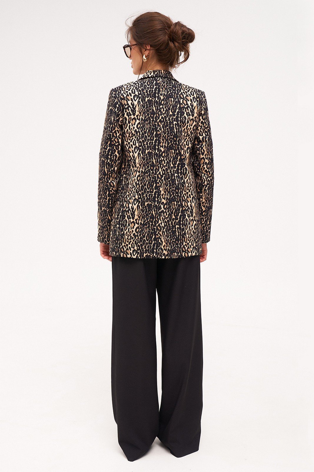 Женский комплект, состоящий из жакета и брюк. Универсальный женский жакет на подкладке прямого силуэта. Перед с центральной застежкой на одну пуговицу, с карманами и с клапанами в шве. Воротник стояче-отложной втачной с отворотом лацкана. Рукав двухшовный, втачной. Брюки женские большого объема, прямого силуэта, вида «палаццо». На передних половинках брюк по линии талии заложены две односторонние складки, направленные в сторону бокового шва и функциональные карманы с отрезным бочком. На задних половинках находятся по две талиевые вытачки. Пояс отрезной, притачной, с уступом на правой передней половинке. На поясе шлевки. Верхний край пояса расположен на естественной линии талии. Застежка брюк – классический гульфик. Застежка пояса на две пуговицы и две петли. Длина брюк в пол. брюки - вискоза 60%, полиэстер 35%, спандекс 5%