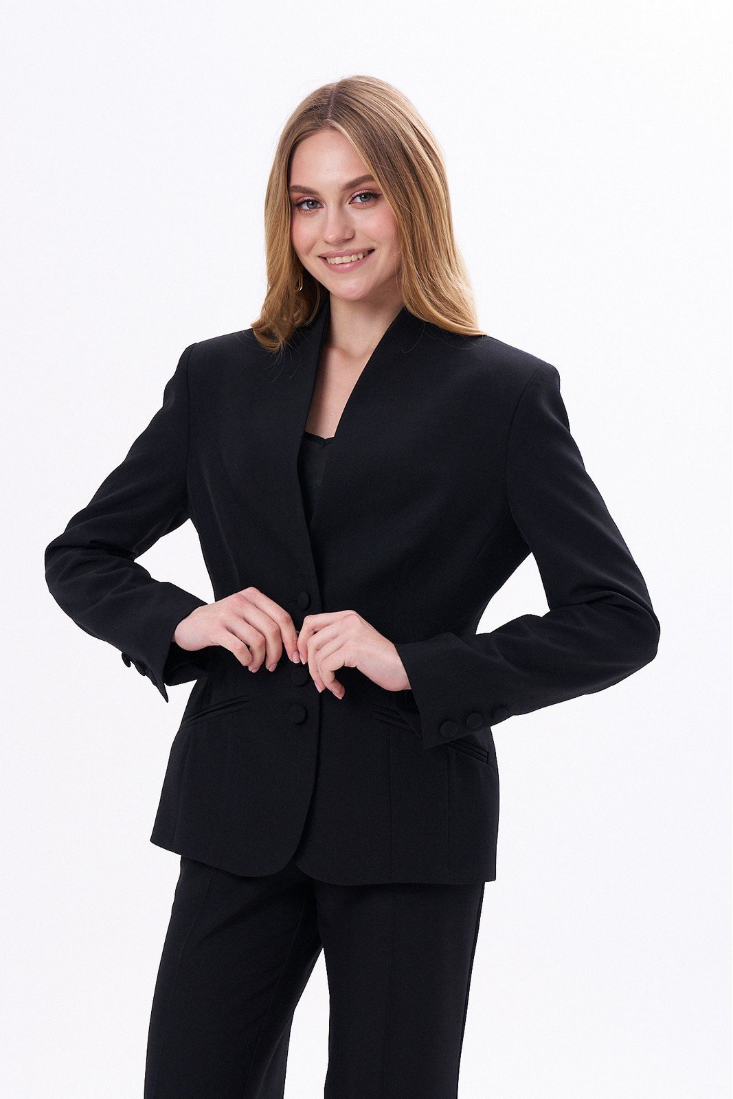 Элегантный женский брючный костюм черного цвета — идеальный выбор для деловых и торжественных мероприятий. Костюм состоит из утонченного приталенного жакета и классических брюк. Жакет дополнен оригинальным воротником-стойкой, который плавно переходит в борта, создавая выразительный силуэт. Модель застегивается на ряд элегантных пуговиц, а на передней части расположены прорезные карманы в рамку, добавляющие функциональности. Рукава оформлены шлицами с пуговицами для добавления изысканности. Брюки, выполненные в классическом стиле, имеют карманы по бокам и слегка расклешенный крой, что придает изделию особую изящность и позволяет аккуратно сочетаться с обувью на каблуке. Этот костюм — отличный выбор для создания строгого, но женственного образа.