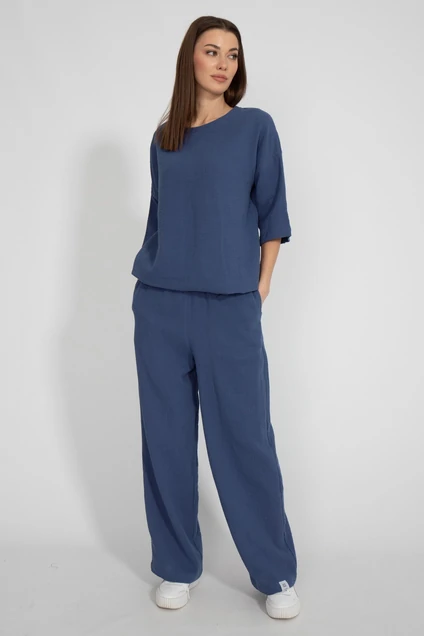 Костюм состоящий из брюк и джемпера. Нежная натуральная хлопковая ткань - муслин. Джемпер свободного кроя. С приспущенным рукавом и кулиской по низу изделия с возможностью регулировки ширины низа. Брюки прямого свободного кроя. С карманами в боковых швах. Рост 170