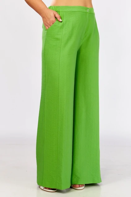 Брючный женский 3-х предметный комплект из облегченной крэшованой ткани с добавлением вискозы. Жакет свободного облегания, удлиненный, однобортный, воротник "шалька", рукав 3/4 с отварачивающимся манжетом. По переду и спинке подрез на уровне талии, ниже подреза по переду две встречных складки и клапаны, по центру спинки ниже подреза встречная складка и хлястик с декоративными пуговицами. Брюки длинные, прямые, с карманами в боковых швах, гульфиком с застежкой на молнию и отрезным поясом с резинкой. Топ свободного облегания, без рукава, вырез горловины мягкое "каре".