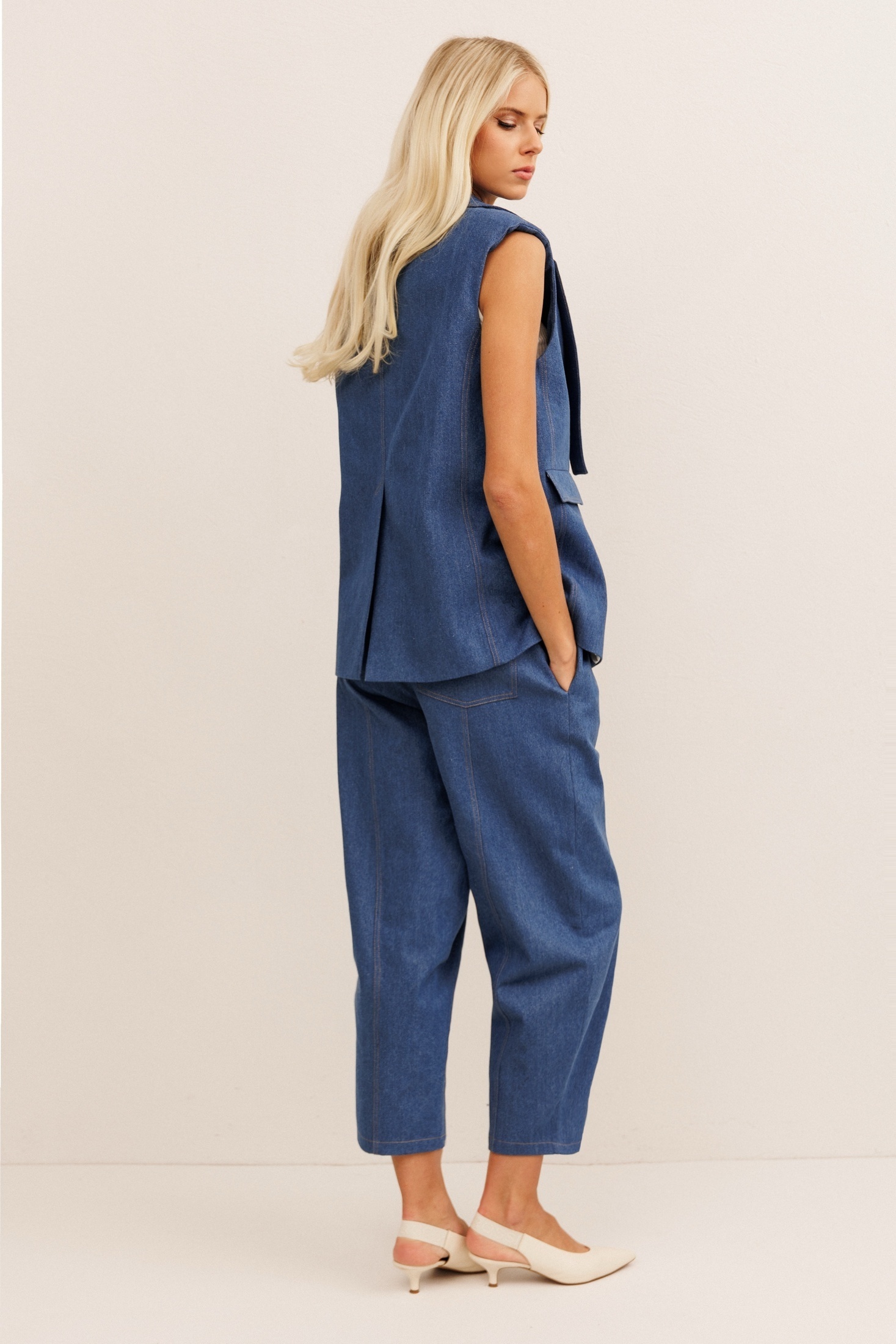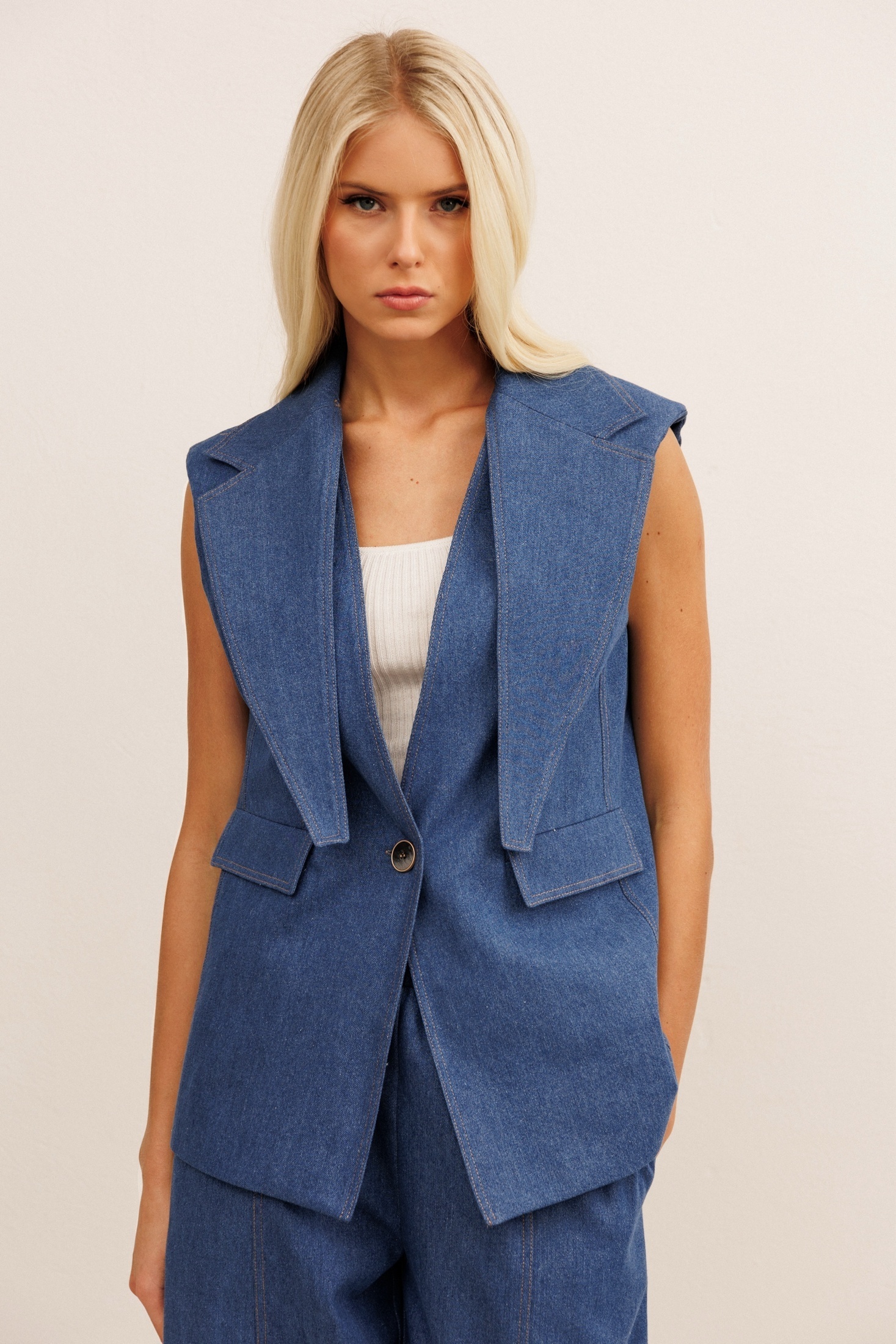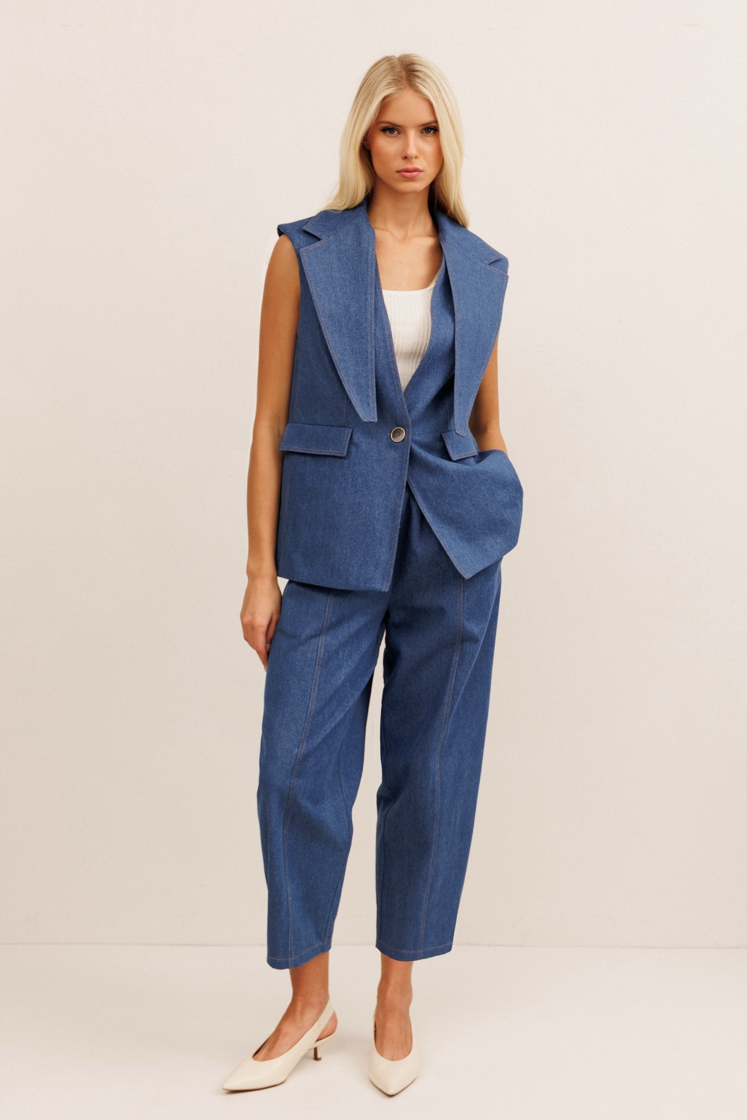 Костюм брючный 30012 синий KOKOdea — стильное решение для современных женщин. Коллекция бренда KOKOdea представляет ансамбль из джинсового хлопка, отличающегося прочностью и комфортом. Жилетка прямого силуэта с застёжкой на пуговицу и отлетным воротником придаёт образу элегантную строгость. Брюки с силуэтом «банан» расширены вверху и заужены к низу, что обеспечивает удобство и свободу движения. Пояс на резинке и фигурные накладные карманы добавляют практичности. Костюм выполнен в синем цвете, подходящем для повседневного и офисного стилей. Он идеально подходит для весенне-летнего сезона, создавая свежий и модный образ на каждый день.