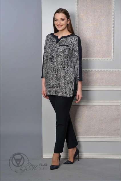 брюки: пэ-71%, вискоза-23%, пу-6%. Костюм 2-х предметный, состоящий из туники и брюк. Туника прямого силуэта, удлиненная с полукруглым вырезом горловины и V-образным по центру. Перед с нагрудными вытачками и фигурной кокеткой из отделочной ткани. На левой стороне фигурный накладной карман с отрезной деталью из отделочной ткани. Спинка с кокеткой. Внизу боковых швов спинки и полочки вставка из отделочной ткани. По краям пришиты пуговицы. Рукава втачные, одношовные, длиной 3/4. Вдоль рукавов лампасы из отделочной ткани.Брюки зауженные к низу. Верх брюк на притачном поясе со шлевками и петлей-пуговица. Вдоль боковых швов карманы. Тесьма-молния в гульфике. От пояса талиевые вытачки. Заднее полотнище с отрезной кокеткой. В срезах кокетки отлетные листочки. Размеры 48-52: Длина туники 70 см, длина рукава джемпера 50 см, длина брюк 100 см. Размеры 54-58: Длина туники 72 см, длина рукава джемпера 51 см, длина брюк 106 см.
