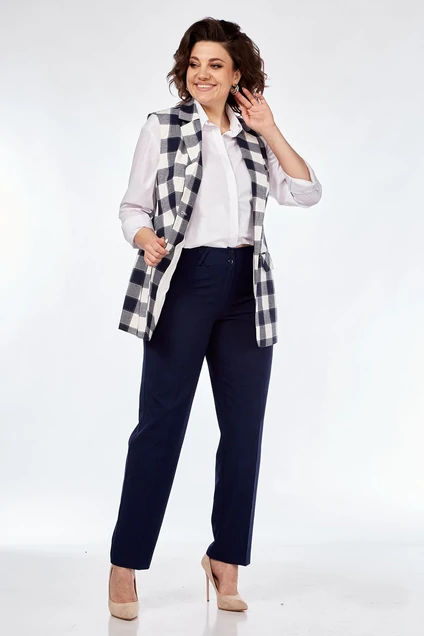 Костюм 2-х предметный, состоящий из жилета и брюк. Жилет удлиненный, на подкладке. Вырез горловины углубленный, V-образный, обработанный отложным воротником с цельнокроеными лацканами. Застежка центральная, бортовая на петли-пуговицы. Перед с бочками, переходящими на спинку карманами в рамку и клапанами. От рамки- талиевые вытачки. Спинка со средним швом. Брюки слегка зауженные к низу, на поясе, с застежкой на петли-пуговицы и гульфиком с застежкой-"молнией". По поясу шлевки. Размеры 48-52: длина жилета 75 см, длина брюк 99 см. Брюки: ПЭ 73%, вискоза 25%, ПУ 2%.