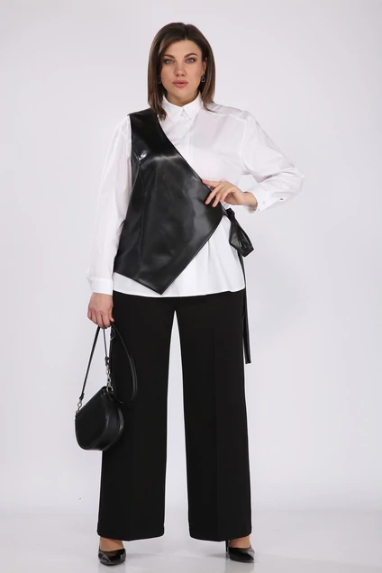 Стильный комплект тройка. Блуза рубашечного кроя, воротник на стойке, рукав втачной, длинный, на манжете. Застежка петли, пуговицы. В боковых швах разрезы. Брюки с высокой посадкой без пояса, расширены от линии бедра. Застежка молния.Асиметричный жилет на одно плечо на завязке, выполнен и эко-кожи. длина изделия по спинке-72см длина изделия по полочке-66см длина рукава от горл-75см. длина брюк-106см длина жилета от горловины- 65см брюки 73% полиэстер 22% вискоза 5% спандекс жилет 69% п/у 31% вискоза 3% эластан
