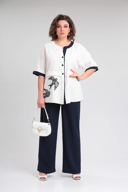 Уникальный и в тоже время очень красивы дизайнерский костюм. Блузка выполнена из ткани “Лён-Вишер”, благодаря свободному крою, создается потрясающий стильный образ в стиле последних модных тенденций,  а аппликация из французского кружева придает романтичности вашему образу. Рукав втачной на спущенной пройме с манжетой в тон брюк. Застежка на петли, пуговицы.