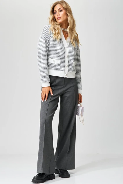 Брюки из плотного трикотажного полотна, на талии, плотно облегающие вверху и прямые к низу, с притачным поясом, в который вставлена эластичная тесьма. На передних половинках брюк в боковых швах обработаны наклонные карманы.