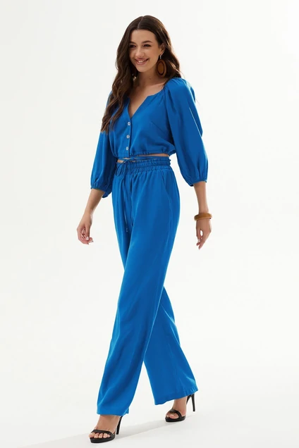 Молодежный комплект выполнен из легкой непрозрачной ткани с шелковистым эффектом. Короткая блуза с фигурным вырезом горловины и застежкой на пуговицы. Горловина оформлена планкой. Впереди нагрудные вытачки, низ блузы с притачной кулиской, сквозь которую продет шнур. Рукав на основе реглана, сверху сборка, внизу резиночка. Брюки длинные, прямые, оформлены притачным поясом с широкой резинкой (на талии), у боковых швов – внутренние карманы