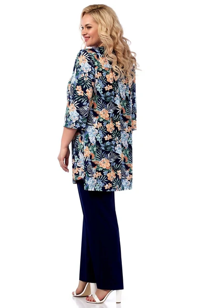 Туника полуприлегающего силуэта, выполнена из легкой шелковистой ткани с вискозой с цветочным принтом. Фигурный вырез горловины оформлен планкой, застежка по планке на пуговицы. По боковым швам разрезы. Спинка ниже переда, рукав чуть ниже локтя с разрезом по внутреннему шву. Брюки классического кроя слегка заужены, на поясе по бокам вставлены резинки.