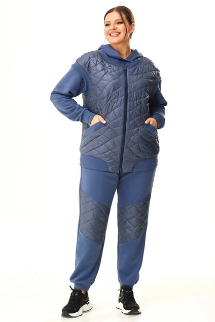 Комплект выполнен из двух тканей: трикотажа х/б и плащевой простеганной ткани с утеплителем. Этот комплект хорош в межсезонье, вплоть до глубокой осени и ранней весны, в нем уютно и тепло. Худи свободного силуэта с капюшоном, внизу оформлен притачной деталью, накладной карман с нашивкой. Линия плеча приспущена, длинный рукав с манжетой. Брюки длинные, на манжетах, на коленях практичные вставки из простеганной ткани. Брюки оформлены поясом с резинкой, у боковых швов – внутренние карманы. Жилет из простеганной ткани с высококачественным утеплителем «флайтекс» – на подкладке. Застежка – разъемная «молния». Вырез горловины, проймы, детали внутренних карманов и низ жилета оформлены деталями из довязов. Комплект добротный, теплый, практичный, модный и красивый.
