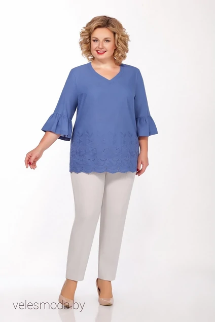 Легкая туника свободного силуэта из 100% хлопка с красивой каймой отлично подойдет для жаркого лета. Фигурный вырез горловины открывает шею, впереди нагрудные вытачки. Рукав 3/4 с притачной пышной манжетой в виде волана. Брюки классического кроя слегка заужены, оформлены притачным поясом по бокам вставлены резинки, застежка молния+пуговица. Состав брюк: 30% лен, 70% ПЭ.Туника выполнена из 100% хлопка.