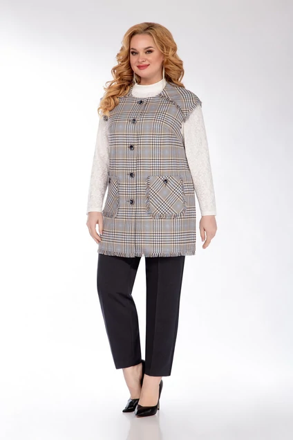 Комплект трехпредметный: жилет, брюки, джемпер. Жилет средней длины свободного силуэта, выполнен из ткани с жаккардовым рисунком. Впереди - застежка на пуговицы, кокетки и накладные карманы подчеркнуты бахромой, карманы фиксируются пуговицами. По спинке - кокетка с бахромой и центральный шов. По боковым швам - разрезы. По низу жилета - бахрома. Аккуратные брючки классического кроя слегка укорочены, оформлены притачным поясом с резинками сбоку, застежка "молния"+ пуговица. Джемпер полуприлегающего силуэта с воротником-стойкой и длинным рукавом выполнен из тонкого трикотажа. Состав ткани брюк 70% ПЭ, 28% вискоза, 2% эластан. Состав ткани джемпера 76% ПЭ, 17% вискоза, 7% спандекс. Длина жилета сзади по спинке 80 см. Длина брюк 95 см. Длина джемпера сзади по спинке 69 см, длина рукава 62 см.