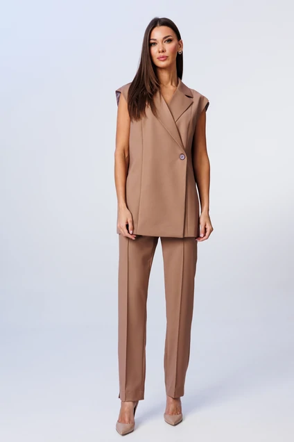 Стильный гармоничный комплект, состоящий из двубортного жилета и полуоблегающих брюк слегка зауженных к низу.