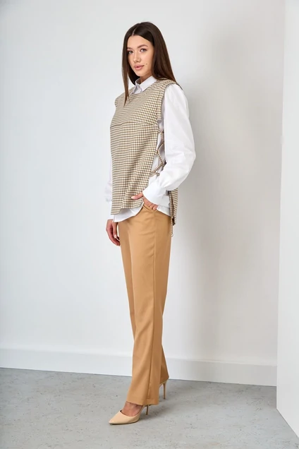 Комплект состоит из свободного жилета на подкладе прямого силуэта с ассиметричным низом (спинка длиннее переда на 5 см).По бокам жилета расположена застежка для шнуровки из металлических полуколец. Перед жилета имеет отрезную кокетку по линии груди, округлую горловину-обтачку и плечевую кокетку, которая переходит на спинку. Спинка жилета имеет центральный средний шов и талиевые вытачки для прилегания. Пройма по окату дополнена стабильной полосой-крылом, шириной 3 см. Длина переда жилета 64 см. Длина спинки по среднему шву 67 см. От плеча 69 см