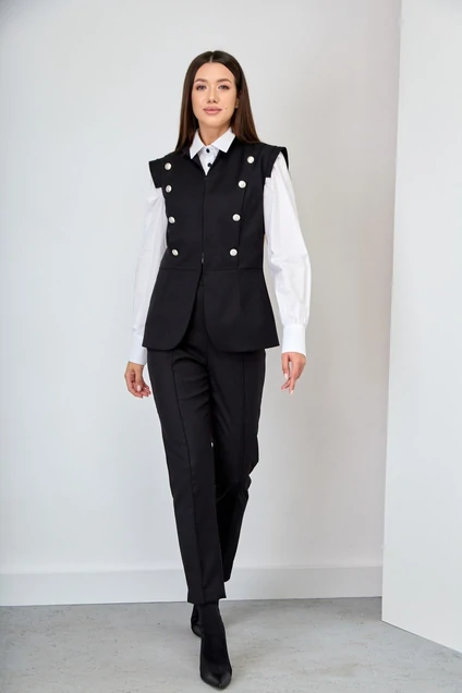 Дизайнерский комплект состоит из рельефного прилегающего жилета на подкладе и отрезной фигурной баской по переду талии изделия(длина 23.5 см). Передняя часть изделия имеет центральные отлетные рельефные детали, на которых расположены вертикально декоративные пуговицы. Застежка фиксируется по центру на крючках «в стык». Спинка состоит из прямой кокетки и рельефных вертикальных деталей-бочков. На линии талии спинки расположен горизонтально фигурный хлястик, который закреплен по краям декоративными пуговицами. Горловина жилета дополнена стойкой. шириной 4 см. Длина жилета по среднему шву спинки 66 см.