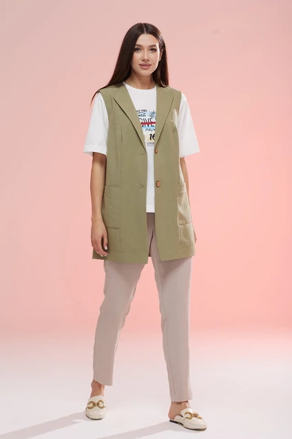 Стильный комплект, состоящий из удлиненного жилета, брюк и майки с принтом. Жилет прямого силуэта с вертикальными рельефами по полочке и накладными карманами, без подкладки. Горловина жилета округлая, с отложными лацканами без воротника. Застежка вертикально-фронтальная на петли/пуговицы. Длина жилета по среднему шву спинки-79 см. Брюки комплекта прямого силуэта, чуть зауженные к низу. В боковых швах расположены внутренние карманы. Пояс со вставленной эластичной тесьмой, шириной 3 см. и дополнительным шнуром-кулисой для четкой фиксации объема талии. Майка комплекта по центру переда с печатным принтом, свободного покроя, с округлым вырезом и коротким рукавом. Длина майки-60 см. Длина рукава-26 см. * фурнитура может отличаться от представленной на рекламном фотоматериале) Особые рекомендации: рекомендуется холодная деликатная ручная стирка, без использования отбеливающих СМС, без интенсивного трения. Сушка в вертикальном положении. ВТО с минимальным паром. майка: 92% хлопок, 8% эластан