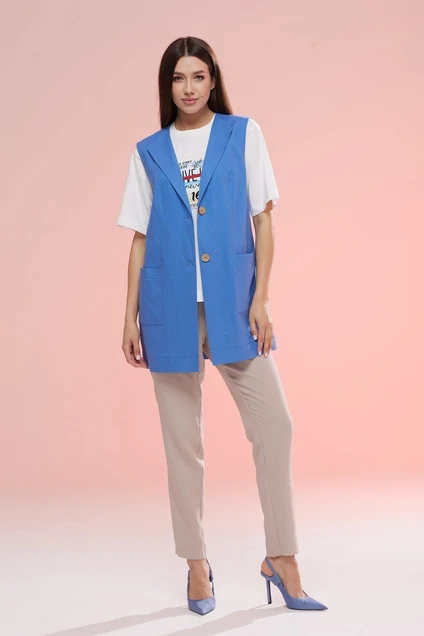 Стильный комплект, состоящий из удлиненного жилета, брюк и майки с принтом. Жилет прямого силуэта с вертикальными рельефами по полочке и накладными карманами, без подкладки. Горловина жилета округлая, с отложными лацканами без воротника. Застежка вертикально-фронтальная на петли/пуговицы. Длина жилета по среднему шву спинки-79 см. Брюки комплекта прямого силуэта, чуть зауженные к низу. В боковых швах расположены внутренние карманы. Пояс со вставленной эластичной тесьмой, шириной 3 см. и дополнительным шнуром-кулисой для четкой фиксации объема талии. Майка комплекта по центру переда с печатным принтом, свободного покроя, с округлым вырезом и коротким рукавом. Длина майки-60 см. Длина рукава-26 см. * фурнитура может отличаться от представленной на рекламном фотоматериале) Особые рекомендации: рекомендуется холодная деликатная ручная стирка, без использования отбеливающих СМС, без интенсивного трения. Сушка в вертикальном положении. ВТО с минимальным паром. майка: 92% хлопок, 8% эластан