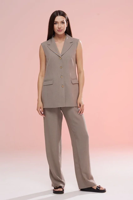 Стильный комплект, состоящий из прилегающего жилета на подкладе и свободных брюк. Жилет прилегающего силуэта на подкладе, однобортный, с классическими Вертикальными рельефами. Изделие дополнено отложным воротником, функциональными карманами в рамку с клапанами и вертикальной фронтальной застежкой на 4 пуговицы, длина жилета по спинке-70 см. Брюки комплекта прямого силуэта. В боковых швах расположены внутренние наклонные карманы. Пояс со вставленной эластичной тесьмой, шириной 3 см. и дополнительным шнуром-кулисой для четкой фиксации объема талии. Длина брюк по боковому шву-113 см