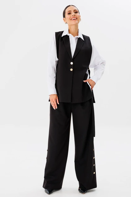 Стильный современный комплект, состоящий из свободного жилета на завязках, брюк в стиле палаццо со шлицами в боковых швах и блузы рубашечного покроя.