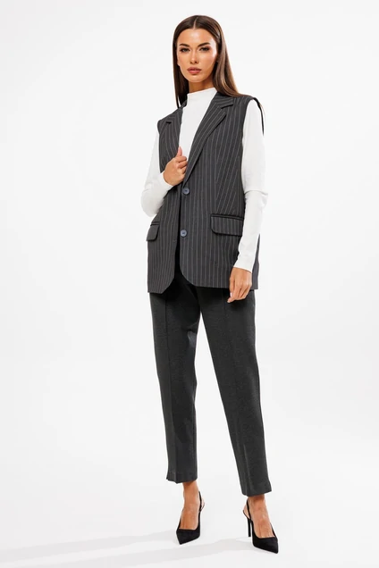 Жилет на подкладке: состоит из костюмной ткани на полочке, центральные детали спинки из устойчивого трикотажного полотна. Жилет прямого силуэта, с притачным бочком на полочке, переходящим на спинку. Спереди горизонтальные прорезные карманы с фигурным клапаном. Воротник жакетного типа, отложной. Борта имеют закругления по нижнему краю. Застежка фронтальная: петли/пуговицы. Спинка имеет средний шов. Пройма жилета окантована трикотажной бейкой. Длина изделия жилета по среднему шву спинки 71-73 см в зависимости от размерного ряда.