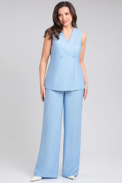 Комплект женский состоящий из жилета и брюк. Жилет приталенного силуэта на х/б подкладке. Перед с вертикальными рельефами из проймы. По спинке средний шов и рельефы из проймы. Без воротника. Застежка центральная бортовая смещенная застегивающаяся на 2 декоративных пуговицы.