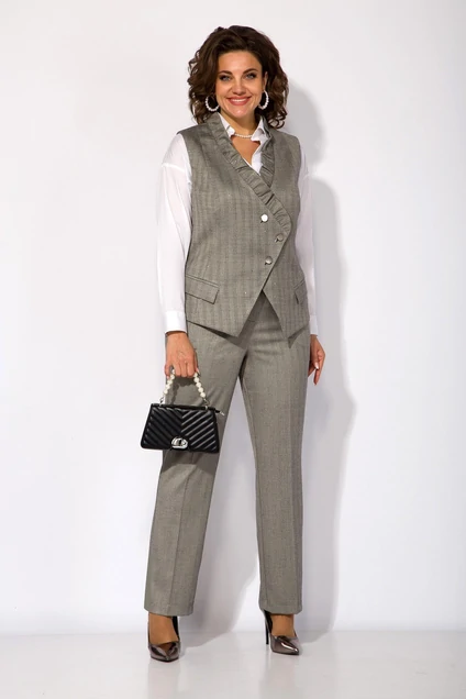 Безумно красивый и стильный костюм, состоящий из жилетки и прямых классических брюк. Эффектная акцентная ткань на жилете придает неповторимость образу. Жилетка полуприлегающего силуэта с эффектным v-образным вырезом горловины. Застежка на петли и пуговицы с фигурным низом. По полочке расположены прорезные карманы с клапаном. Спинка с продольными рельефами. Модель на шелковой подкладке в тон изделия. Брюки в комплекте со средней посадкой, прямого классического кроя. Имеются боковые карманы и заутюжены стрелки. Застежка – брючная тесьма молния с обработанным гульфиком. Пояс притачной, в боковых участках вставлена резинка для более комфортного прилегания.