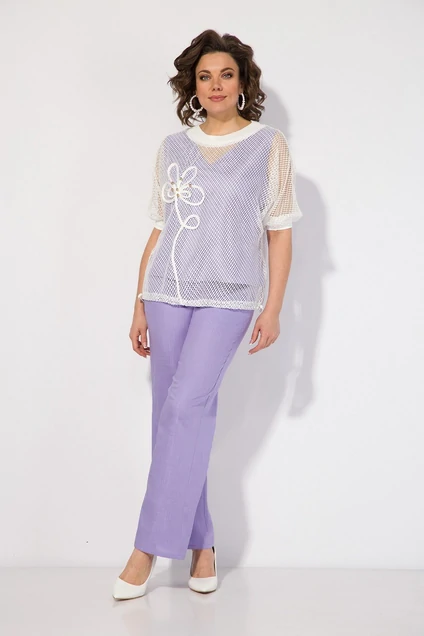 Блузон свободного силуэта, с цельнокроеным рукавом длиной ¾-ти выполнен из сетки. Вырез горловины, а также низ рукава обработан притачной манжетой из кашкорсе. Лиф декорирован вышивкой в виде цветка с бусинами. Низ изделия присбаривается на кулиску. Длина топа – 55 см. Блузон – 60 см, рукав – 38 см. Брюки – 110 см.