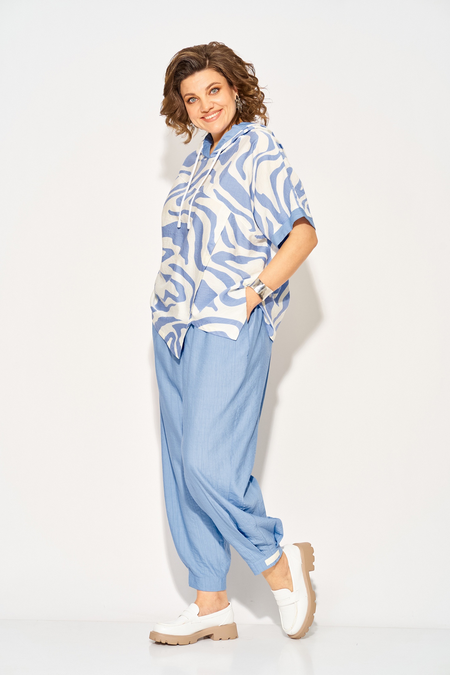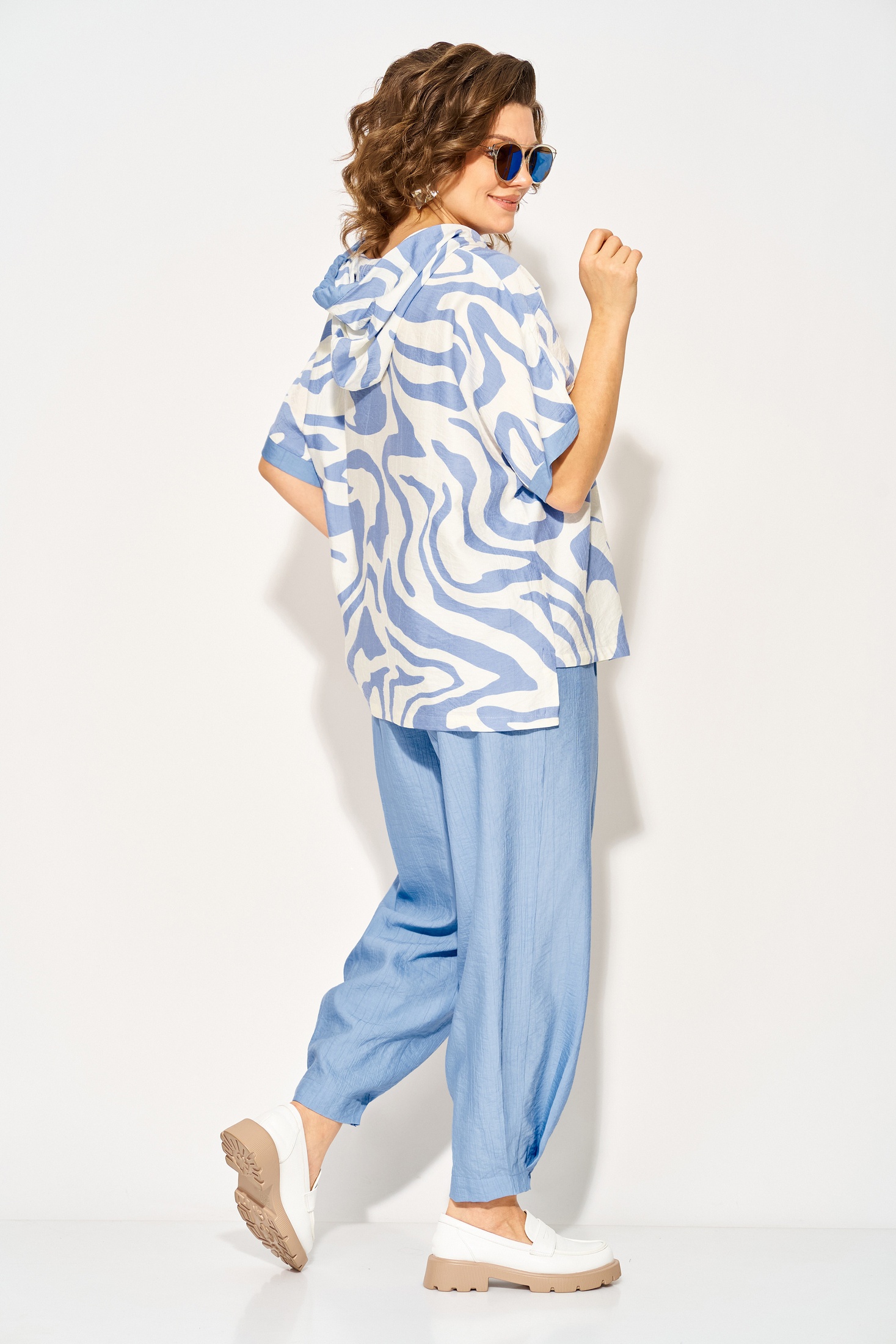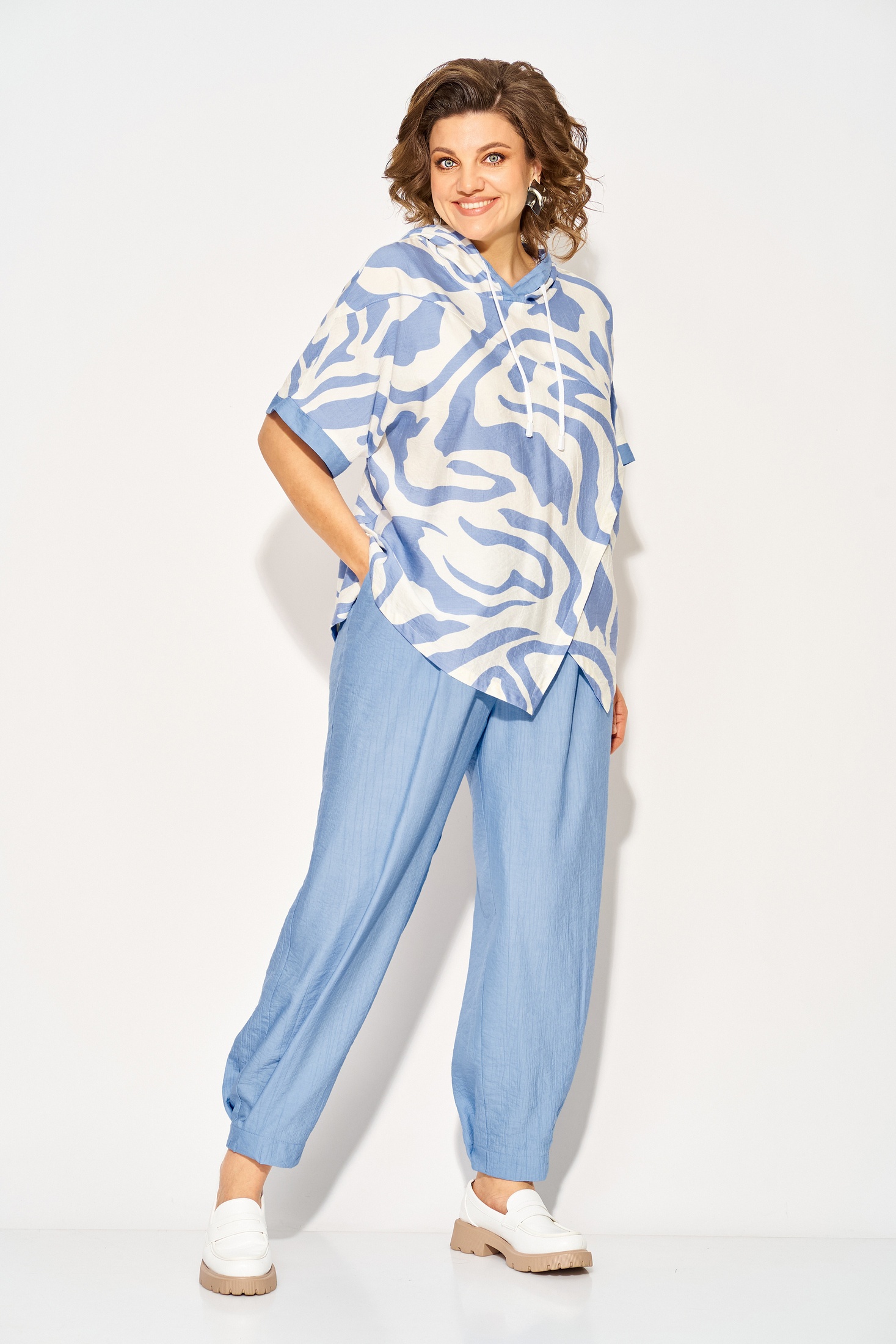 Костюм брючный 1438л голубой Liliana-style — это идеальный выбор для летнего сезона. Коллекция бренда Liliana-style сочетает в себе комфорт и стиль благодаря использованию вискозы и льна для создания легкой и дышащей ткани. Удлиненная туника свободного кроя с капюшоном и кулиской на шнуровке добавляют динамичности образу, а ассиметричный подрез и разноуровневый низ придают индивидуальность. Брюки с завышенной посадкой и боковыми карманами обеспечивают практичность и комфорт. Длина туники по спинке составляет 68 см, длина брюк — 98-100 см. Этот комплект в голубых тонах идеально подходит для повседневных прогулок.