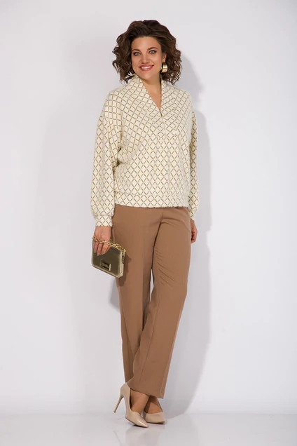 Мягкий и уютный джемпер в стиле «OLD MONEY» выполнен из трикотажа с эффектом ангоры тс рисунком. Эффектная V-образна горловина, переходящая в мягкую стойку. Плечевой пояс спущенный, с рукавом полной длины. Низ изделия и низ рукава оформлен притачными манжетами из основной ткани. Спинка без особенностей. В комплекте классические женские брюки, со средней посадкой, прямого покроя от бедра. Застежка – брючная тесьма-молния с обработанным гульфиком. Карманы боковые. Пояс притачной, в боковых участках вставлена резинка на свободу. По переду заутюжены канты. Спинка с Талиевыми выточками. Подгибка брюк –– 4 см. Длина по спинке – 65 см, рукав- 62 см. Брюки – 104 см.