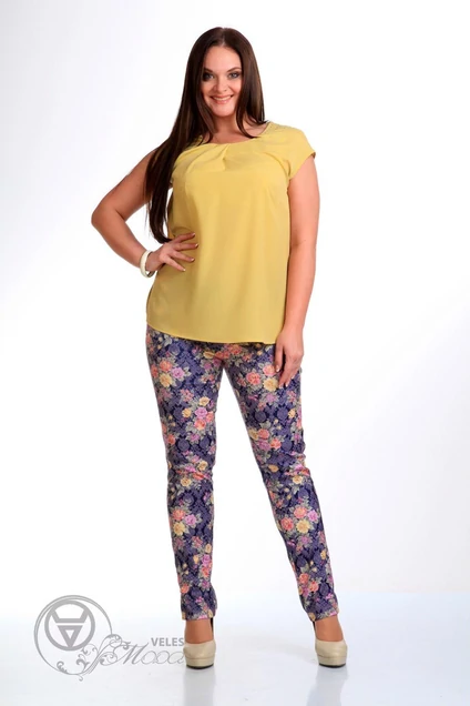 Комплект блуза+брюки, Брюки выполнены из жакардового джинса со стрейчем. В низу брюк в боковых швах вставлены декоративные молнии. Блуза из крепа. Длина брюк: 104см Длина блузы: 71см