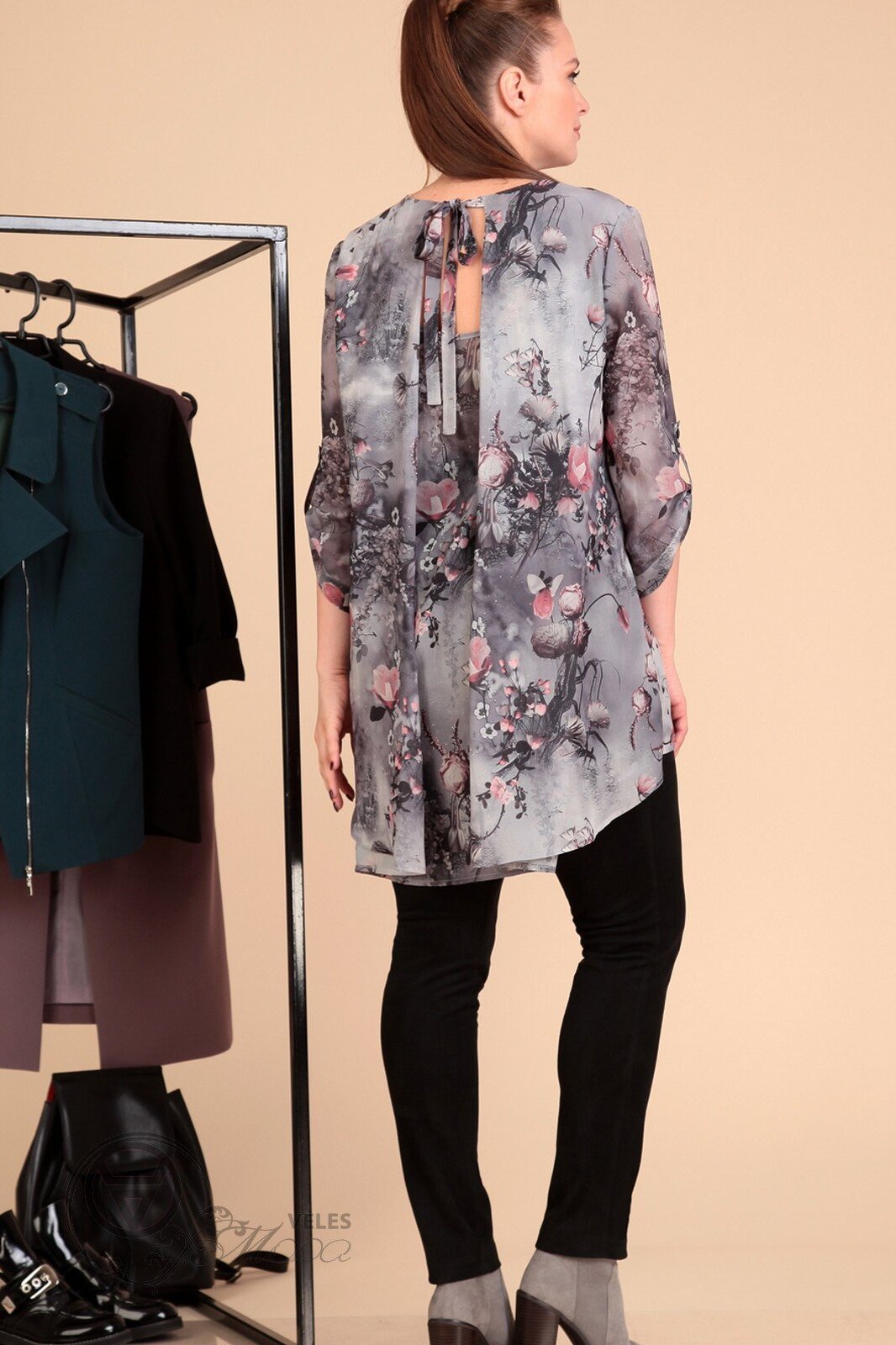 Комплект женский 2-х предметный: брюки и блуза. Брюки выполнены из ткани «под замш», на трикотажной основе, хорошо тянутся. Верх брюк обработан на широкой резинке, на задних половинках имеются накладные карманы. Рукав блузы можно носить как в застегнутом на пату, так и в расстегнутом виде. Длина брюк: 101 см. Длина блузы по переду: 67см. Длина блузы по спинке от плечевого шва: 90см. Длина рукава блузы в расстегнутом виде: 49 см. Состав брюк: хлопок 35%, ПЭ 60 %, лайкра 5%.