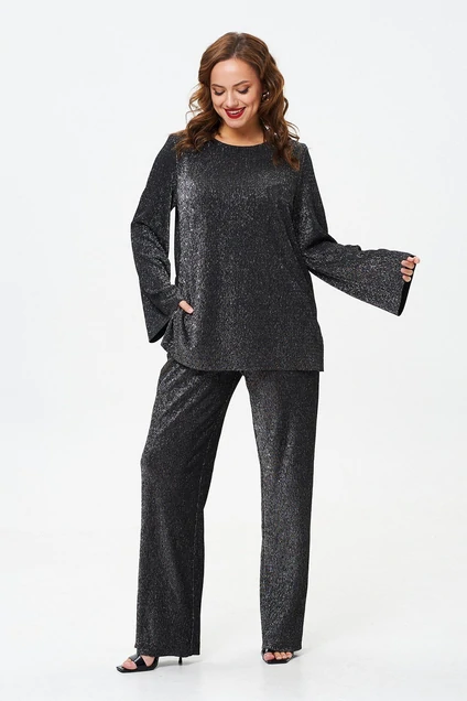 Костюм выполнен из струящейся ткани с люрексом. Блуза свободного силуэта. Горловина округлой формы обработана обтачкой. Рукав втачной, расклешённый к низу. По переду блузы нагрудные выточки, по боковым швам разрезы. Брюки прямого силуэта. Верх брюк на притачном поясе с эластичной тесьмой. В боковых швах карманы с наклонным входом.