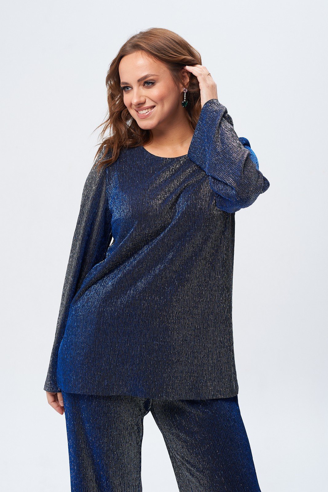 Костюм выполнен из струящейся ткани с люрексом. Блуза свободного силуэта. Горловина округлой формы обработана обтачкой. Рукав втачной, расклешённый к низу. По переду блузы нагрудные выточки, по боковым швам разрезы. Брюки прямого силуэта. Верх брюк на притачном поясе с эластичной тесьмой. В боковых швах карманы с наклонным входом.