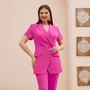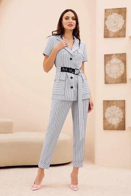 Жакет со стояче-отложным воротником пиджачного типа и центральной застёжкой на петли и пуговицы. На уровне талии съёмный пояс с дизайнерской вышивкой. Перед с клапанами в верхней части и карманами в нижней. Спинка с талиевыми вытачками и шлицей в среднем шве. Рукава втачные.