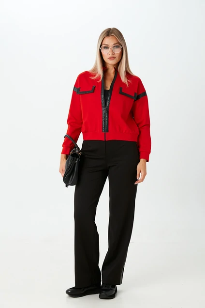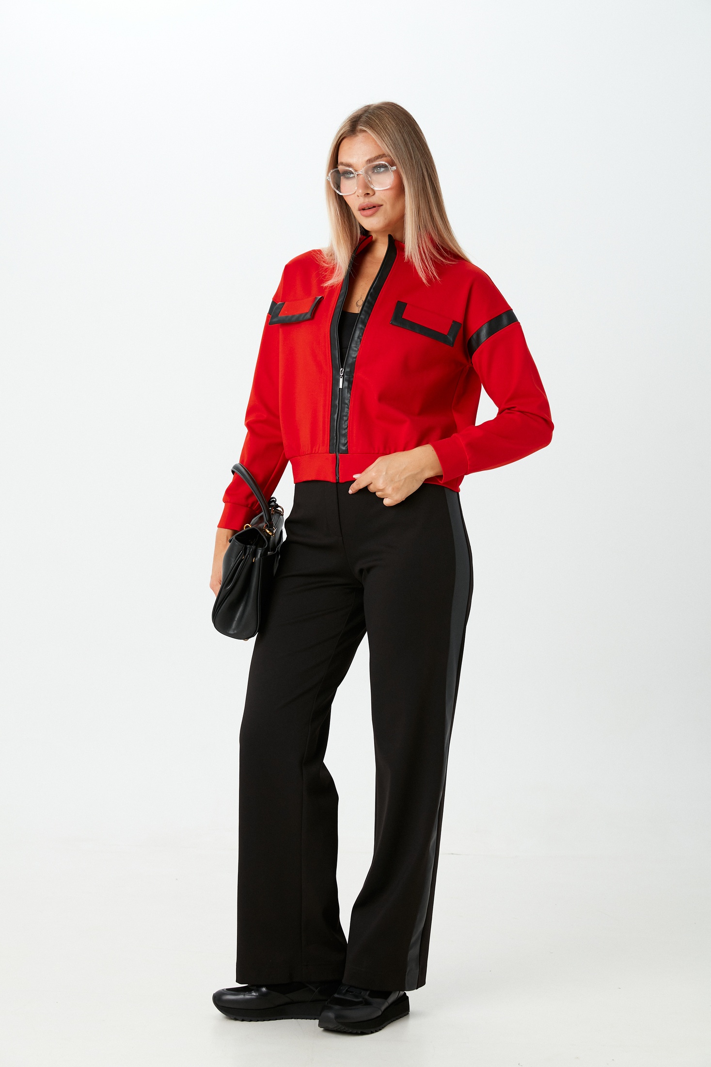 Комплект 2ка, состоящий из джемпера и брюк. Укороченный джемпер свободного силуэта с застёжкой на молнию. Воротник - стойка. По переду выполнена имитация карманов с клапанами с окантовкой из экокожи. На рукавах и вдоль молнии также вставка из экокожи. Брюки прямого силуэта свободного объёма. Застёжка на молнию и пуговицу. Вдоль боковых швов расположены лампасы из экокожи. Пояс и задние накладные карманы также выполнены из экокожи.