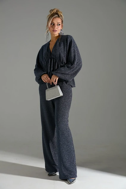 Костюм 2ка, состоящий из блузки и брюк. Блузка свободного силуэта с V-образным вырезом горловины. Рукав блузки цельнокроеный, по низу собранный на резинку. По линии груди вставлена эластичная резинка. Брюки прямого силуэта с резинкой по талии.