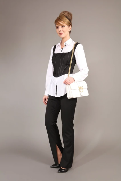 Комплект женский тройка, состоящий из блузы, корсета и брюк. Белая блузка – неизменная и универсальная классика. Отложной воротник с отрезной стойкой и застежкой-планкой на петли и пуговицы. Планка оформлена декоративной лентой. Полочки с нагрудными выточками. Полочку дополняет накладной карман. Рукав втачной длинный, низ рукава оформлен притачной манжетой на две пуговицы. Чёрный топ корсетного типа прилегающего силуэта на бретелях. По переду и спинке топа фигурные рельефы и боковые подрезы. Нижний край переда фигурной формы. Топ-корсет на подкладке. Застежка топа на разъемную молнию в среднем шве спинки. Длина выше линии талии. Корсет - универсальная часть женского гардероба. Модницы во всем мире используют его, чтобы скрыть недостатки своего телосложения и подчеркнуть талию. Если сразу после работы вам предстоит свидание или вас пригласили в ресторан, а времени, чтобы заехать домой и переодеться нет, то стоит надеть корсет без блузы. Брюки малого объема, прямого силуэта. На передних половинках с обеих сторон расположены под наклоном нефункциональные прорезные карманы в рамку. На задних половинках расположены вытачки. Пояс отрезной. Верхний край пояса расположен на линии талии. На поясе расположены шлевки. Застежка брюк – гульфик на молнии, на поясе крючок и петля. В нижней части шаговых швов оформлены высокие разрезы. Длина брюк ниже уровня щиколоток – увеличена с учетом высоты каблука. Замеры: Рост фотомодели 166 см. Размер у фотомодели – 42. Блуза: 35% хлопок, 65% полиэстер