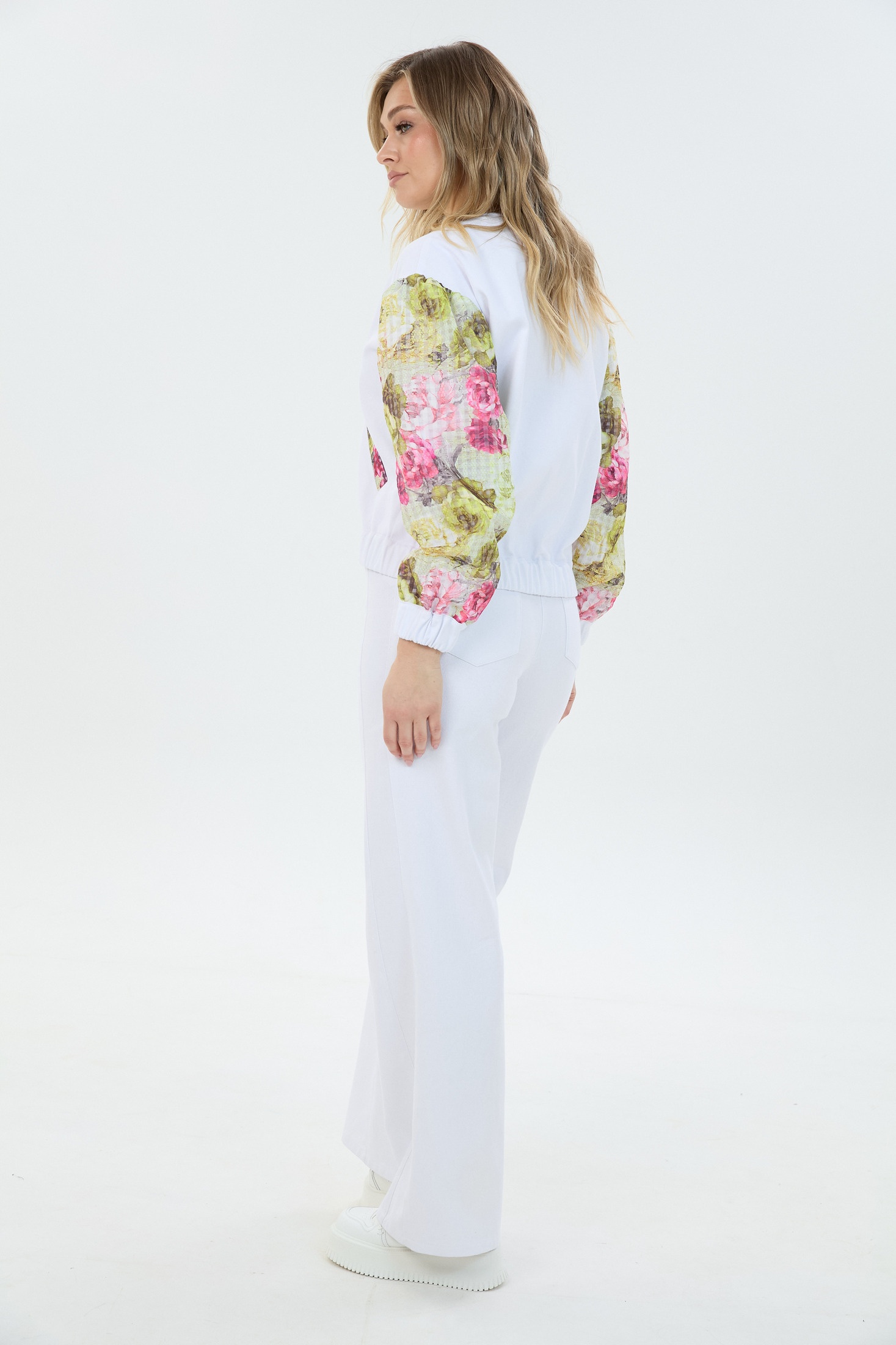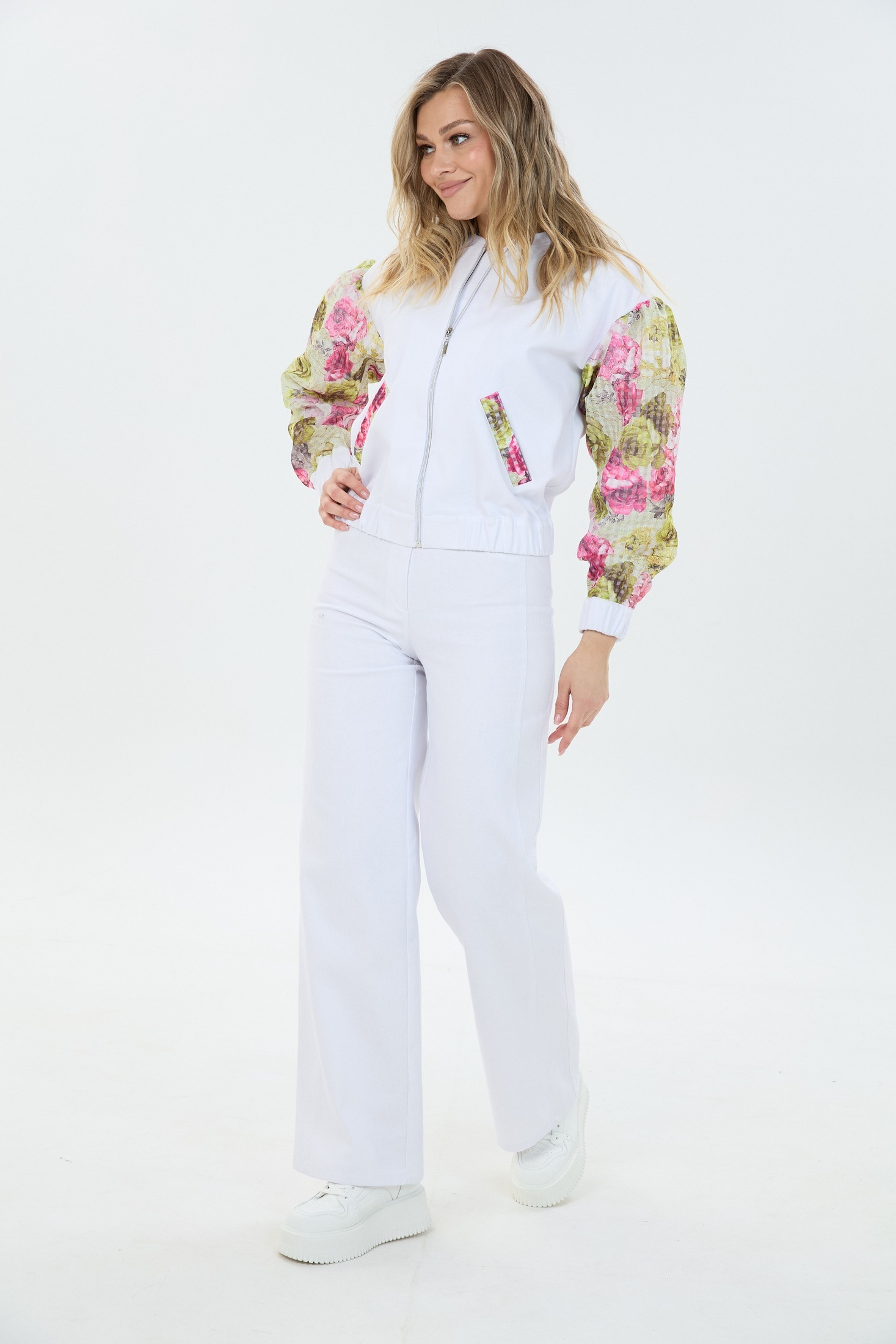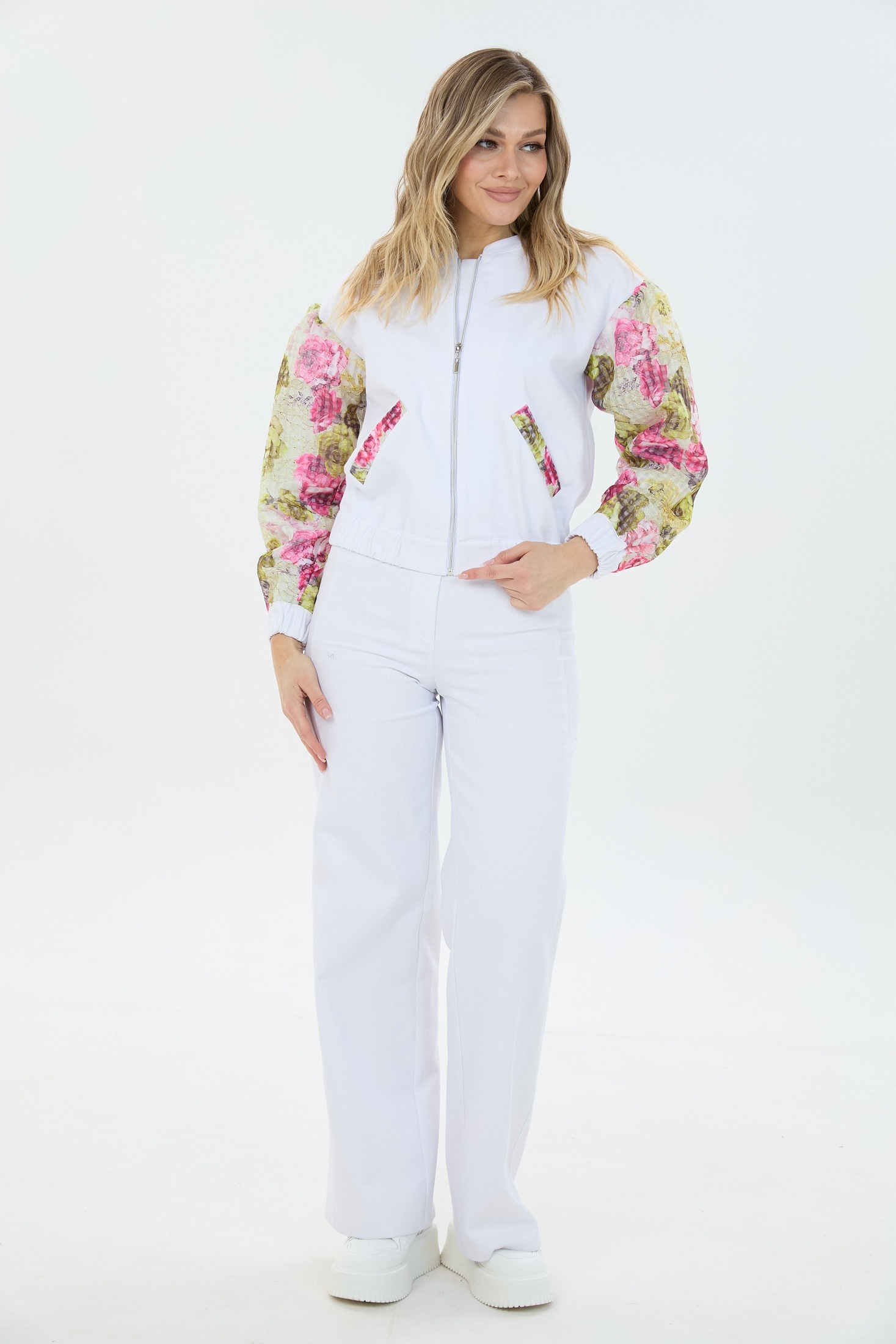 Костюм брючный К1680194 LM (Лаборатория моды) - это современный комплект из коллекции бренда Лаборатория моды. Выполненный из 100% хлопка, костюм дарит невероятный комфорт и стиль. Объёмный бомбер с цветочными вставками и застёжкой на молнию привлекает внимание, а брюки свободного кроя с молнией и пуговицей обеспечивают удобство в движении. Этот стильный сет идеально подходит для весенних и летних прогулок, добавляя нежный белый акцент в ваш гардероб. Модные рукава и карманы из лёгкой ткани подчёркивают игривый повседневный стиль.