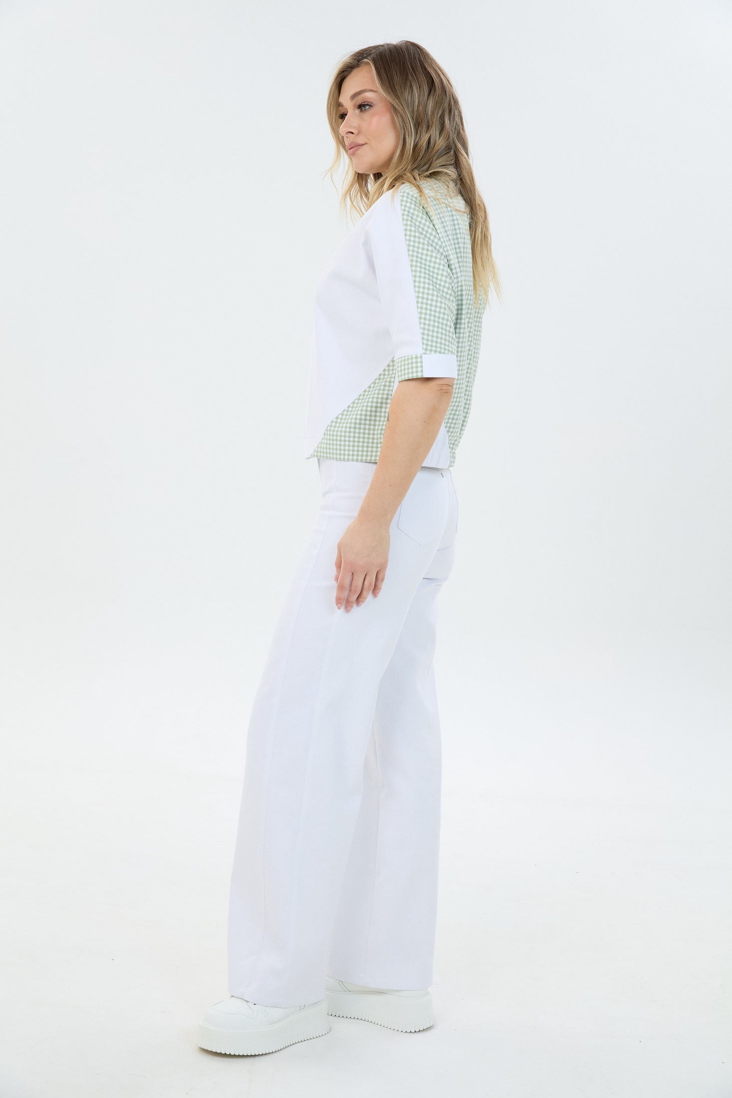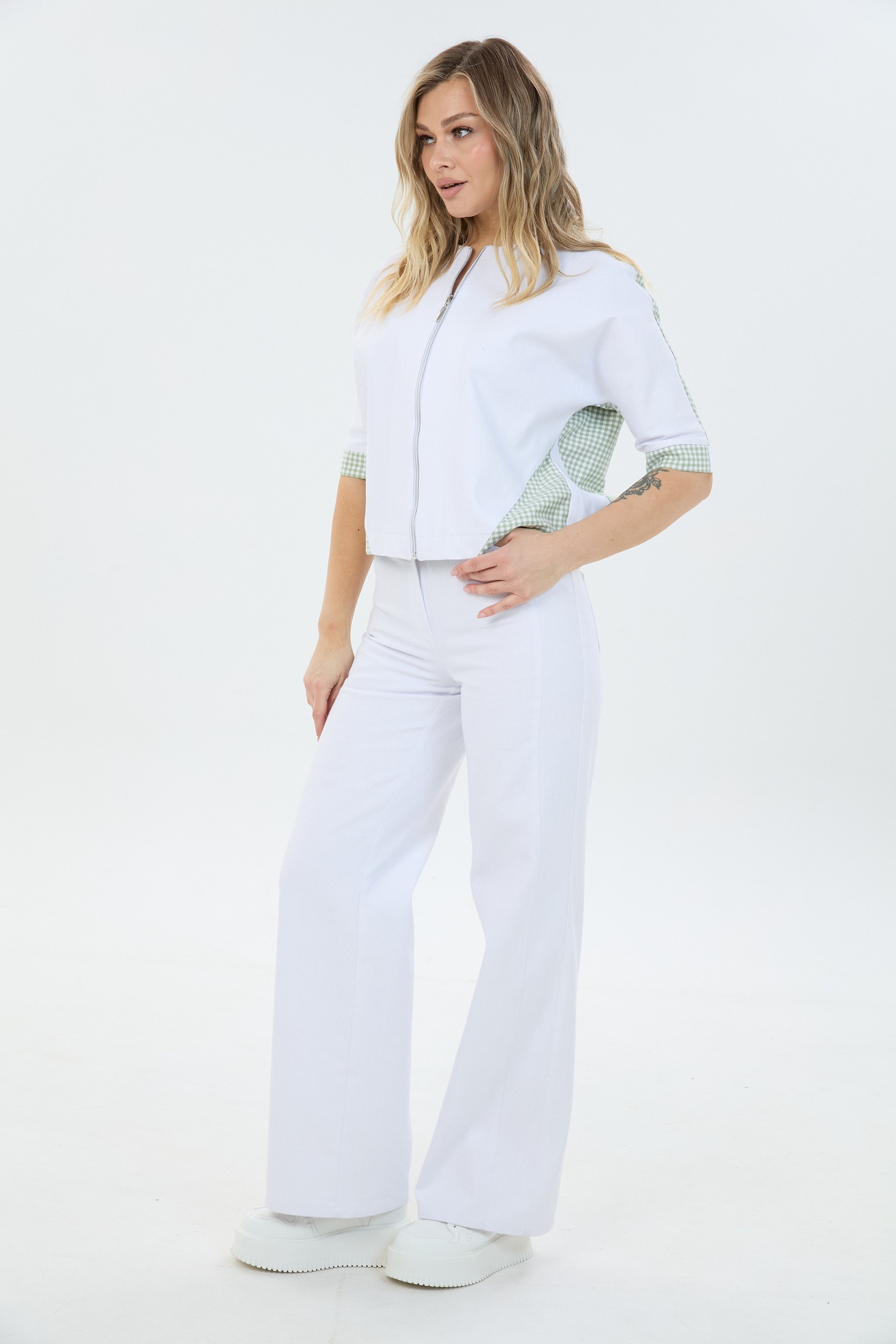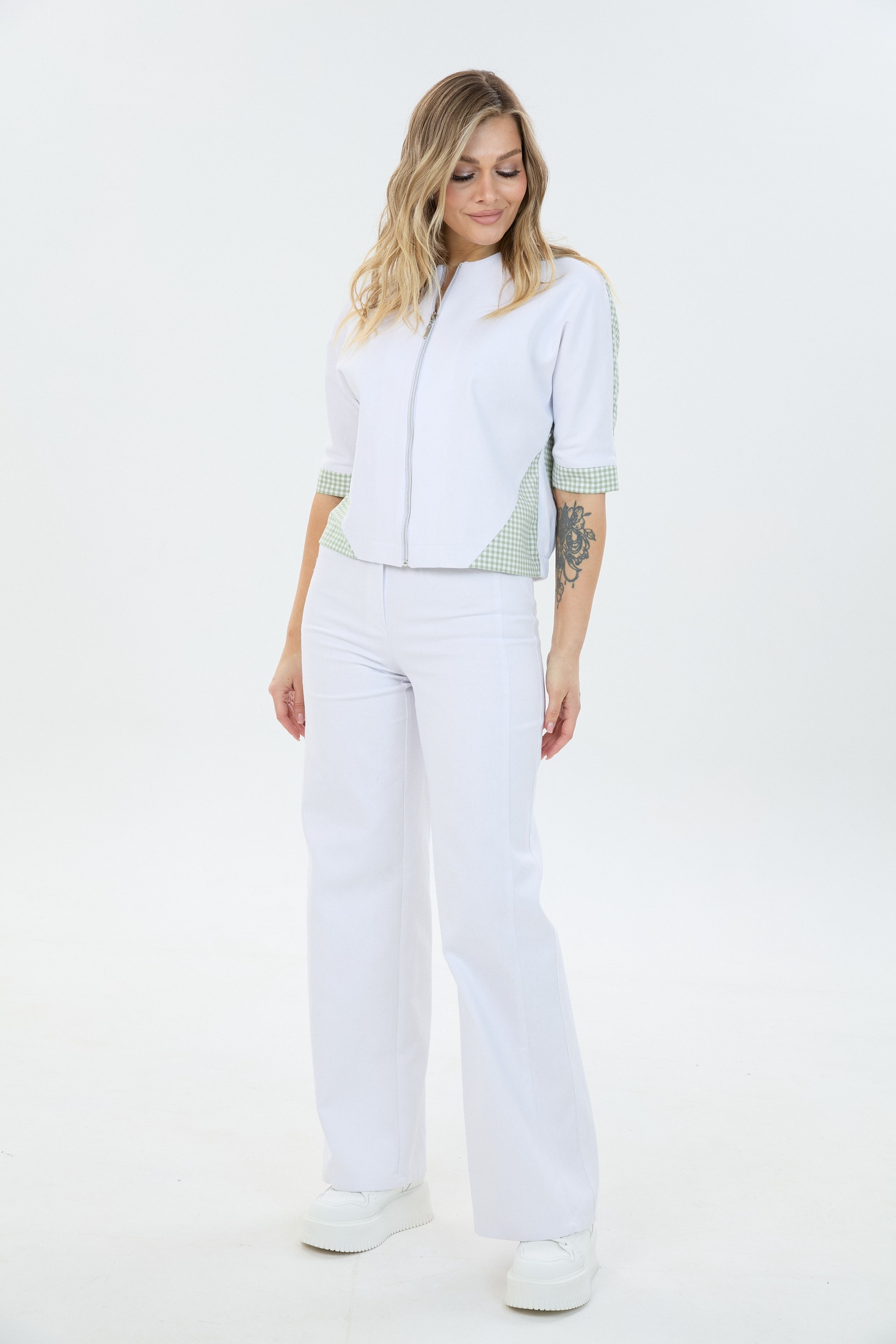Костюм брючный К8248 белый джинс LM (Лаборатория моды) — стильное решение для повседневного образа. Коллекция бренда Лаборатория моды представляет элегантный брючный костюм из 100% хлопка, что гарантирует комфорт и легкость. Джемпер свободного силуэта выполнен из двух видов ткани и оснащен удобной молнией. Оригинальный элемент — рукава чуть ниже локтя с имитацией манжеты, делают его неотъемлемой частью любого гардероба. Брюки прямого силуэта на резинке с боковыми карманами практичны и удобны. Белый цвет добавляет свежести и лёгкости образу, а свобода фасона делает костюм идеальным выбором для весенне-летнего сезона. Подходит для повседневных прогулок и офисного стиля.