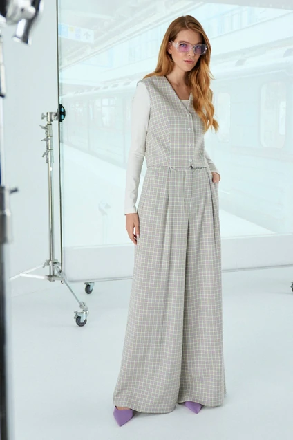Комплект брючный. Жилетка длиною до линии талии. Прямого силуэта. Застежка центральная на петли-пуговицы. Горловина V-образной формы.