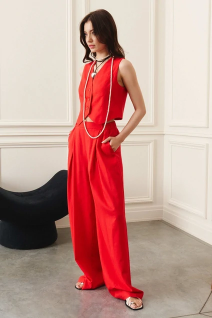 Комплект состоит из жилета и брюк. Жилет полуприлегающего силуэта на хлопковой подкладке. V-образный вырез горловины, застёжка на петли и пуговицы, низ жилета фигурный. На левой половинке переда в верхней части карман листочка, по спинке средний шов. Брюки свободного кроя, прямые. По линии талии притачной пояс частично на резинке. На передней половинке брюк от талии глубокие складки на запах. В боковых швах карманы.