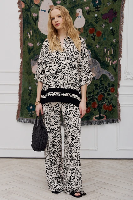 Комплект состоит из блузы и брюк. Блуза свободного кроя, рукав спущенный, по низу рукава манжета. Воротник рубашечного кроя, на стойке застежка на короткую планку, по низу отрезные детали из отделочной ткани. Брюки прямые, на притачном поясе на резинке. В боковых швах прорезные карманы.