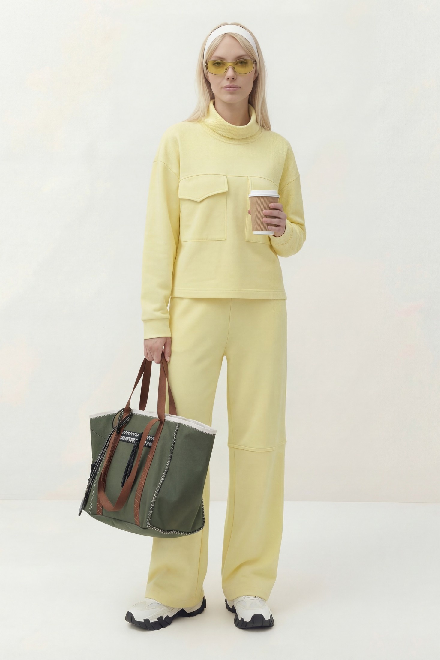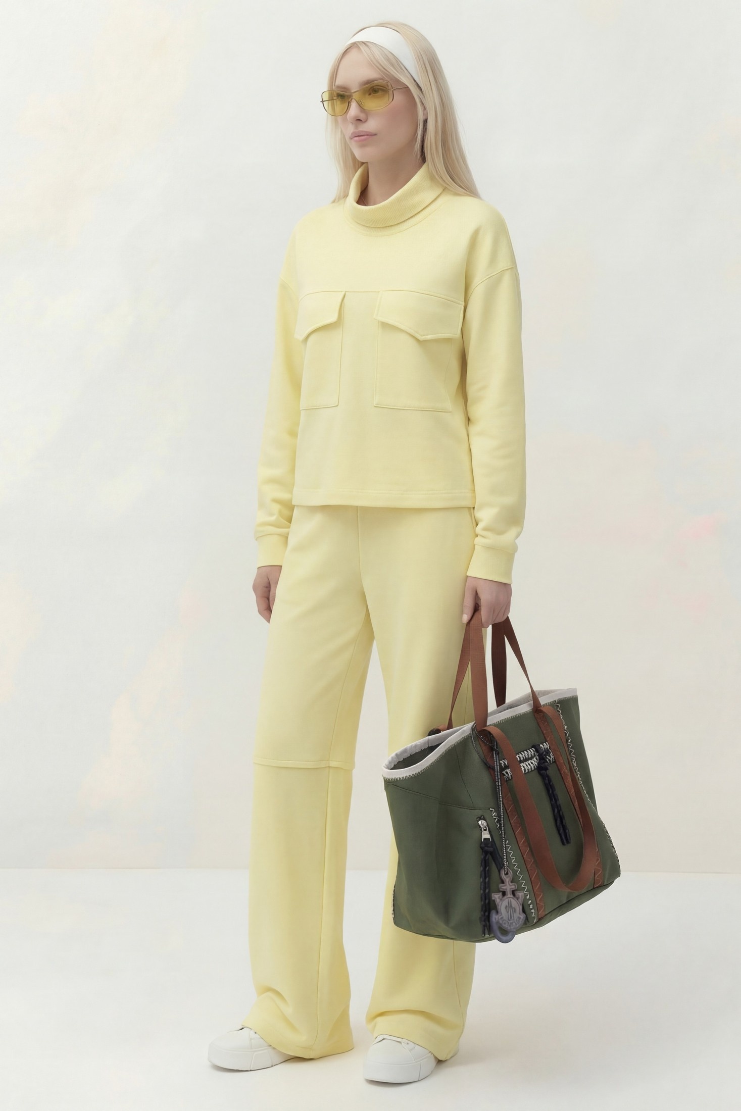 Костюм брючный 1869 Lokka – это стильный комплект из коллекции бренда Lokka, который идеально подходит для повседневной носки. Изготовлен из мягкого хлопка с добавлением эластана, что придаёт материалу эластичность и комфорт. Свитшот прямого силуэта с декорированными накладными карманами и воротником-стойкой обеспечивает стильный вид и практичность, отлично подходит на весну и осень. Брюки с притачным поясом на резинке обеспечивают комфорт и удобство в движении. Длинные широкие брюки расклешены к низу и имеют подрез на колене. Нежный жёлтый цвет добавляет свежести в образ, а длина брюк от пояса 105 см и длина свитшота по спинке 55 см делают комплект особенно комфортным.